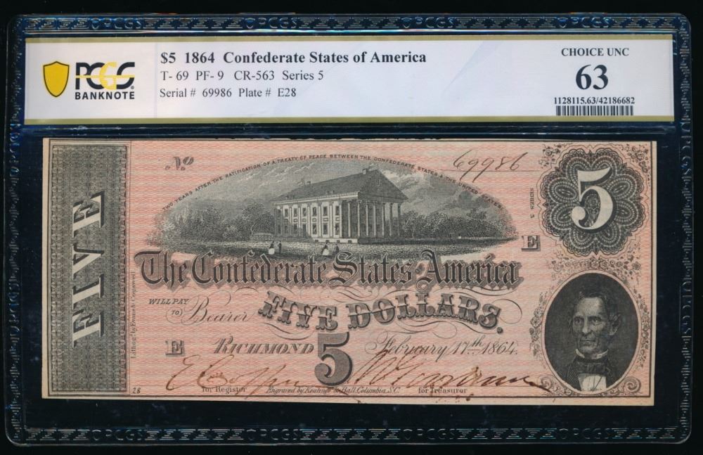 One 1864 $5 T-69 Confederate PCGS 63.