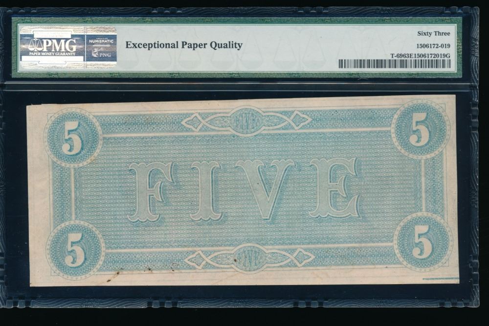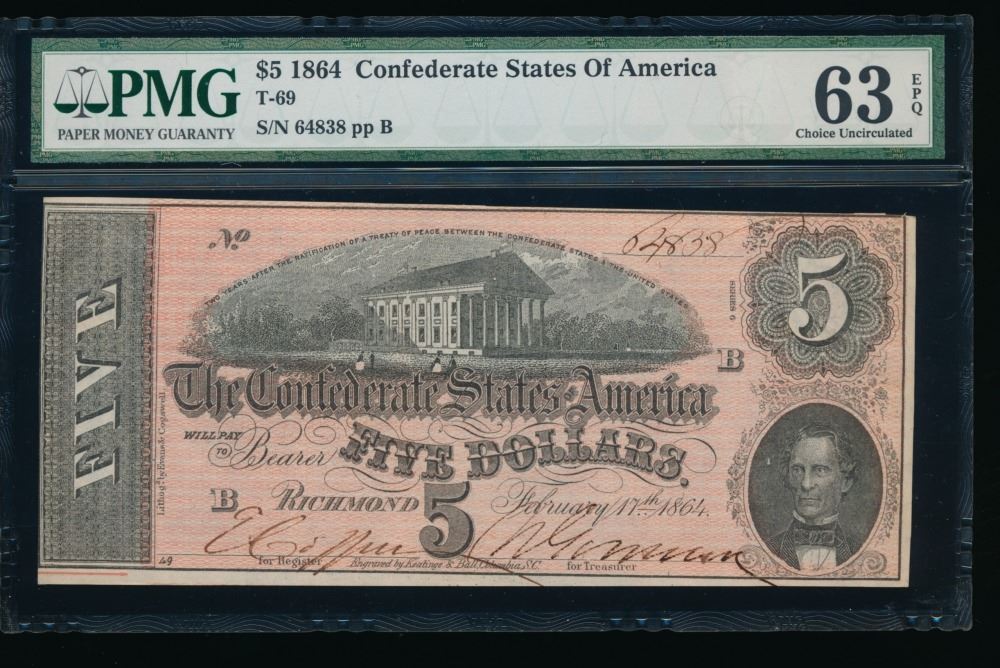 One 1864 $5 T-69 Confederate PMG 63EPQ.