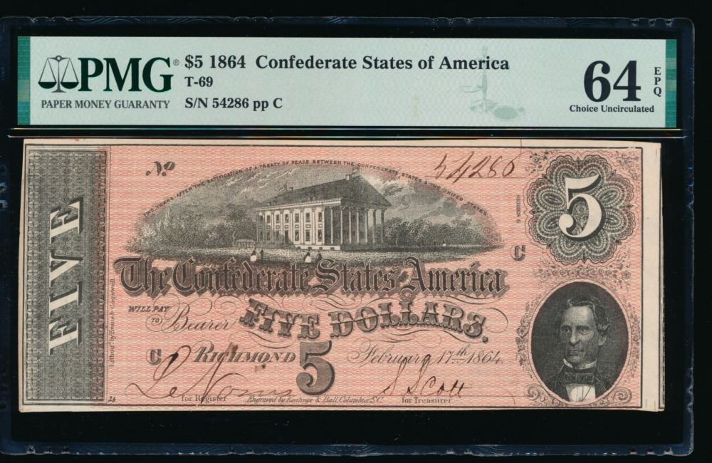 One 1864 $5 T-69 Confederate PMG 64EPQ.