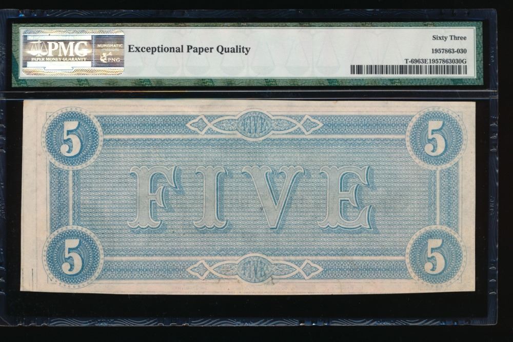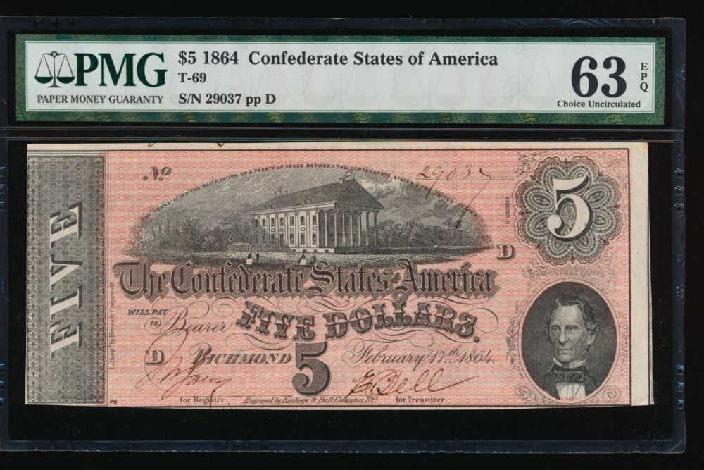 One 1864 $5 T-69 Confederate States of America PMG 63EPQ.