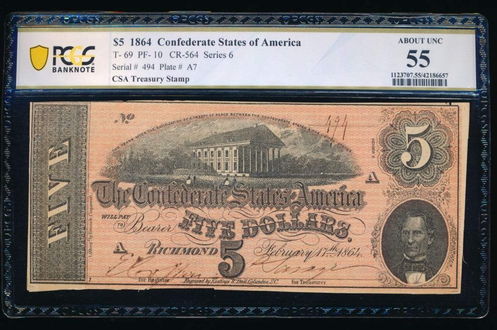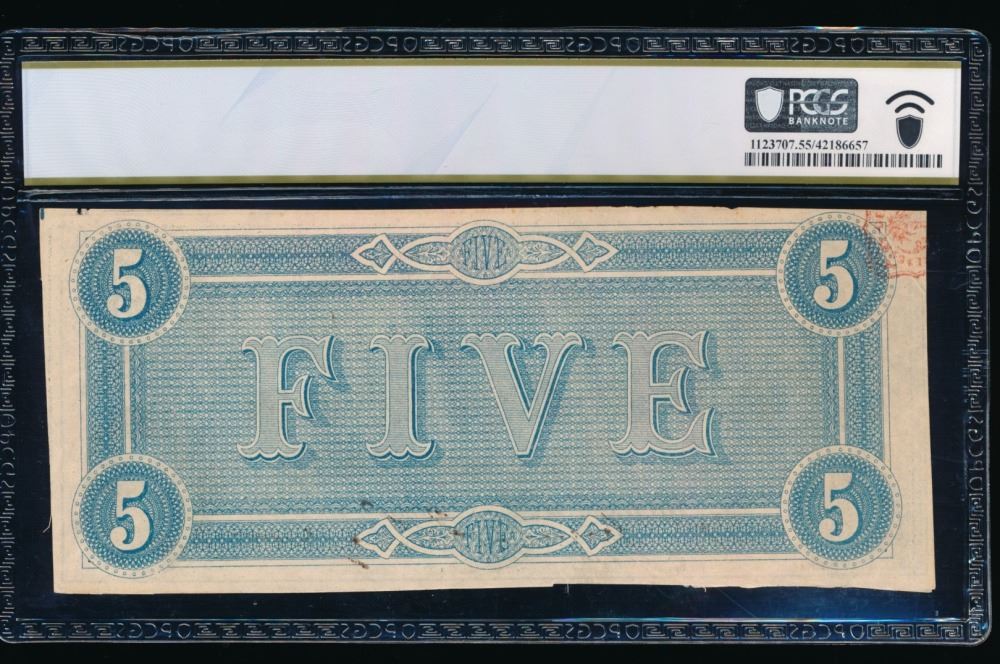 One 1864 $5 T-69 RADAR Confederate PCGS 55.