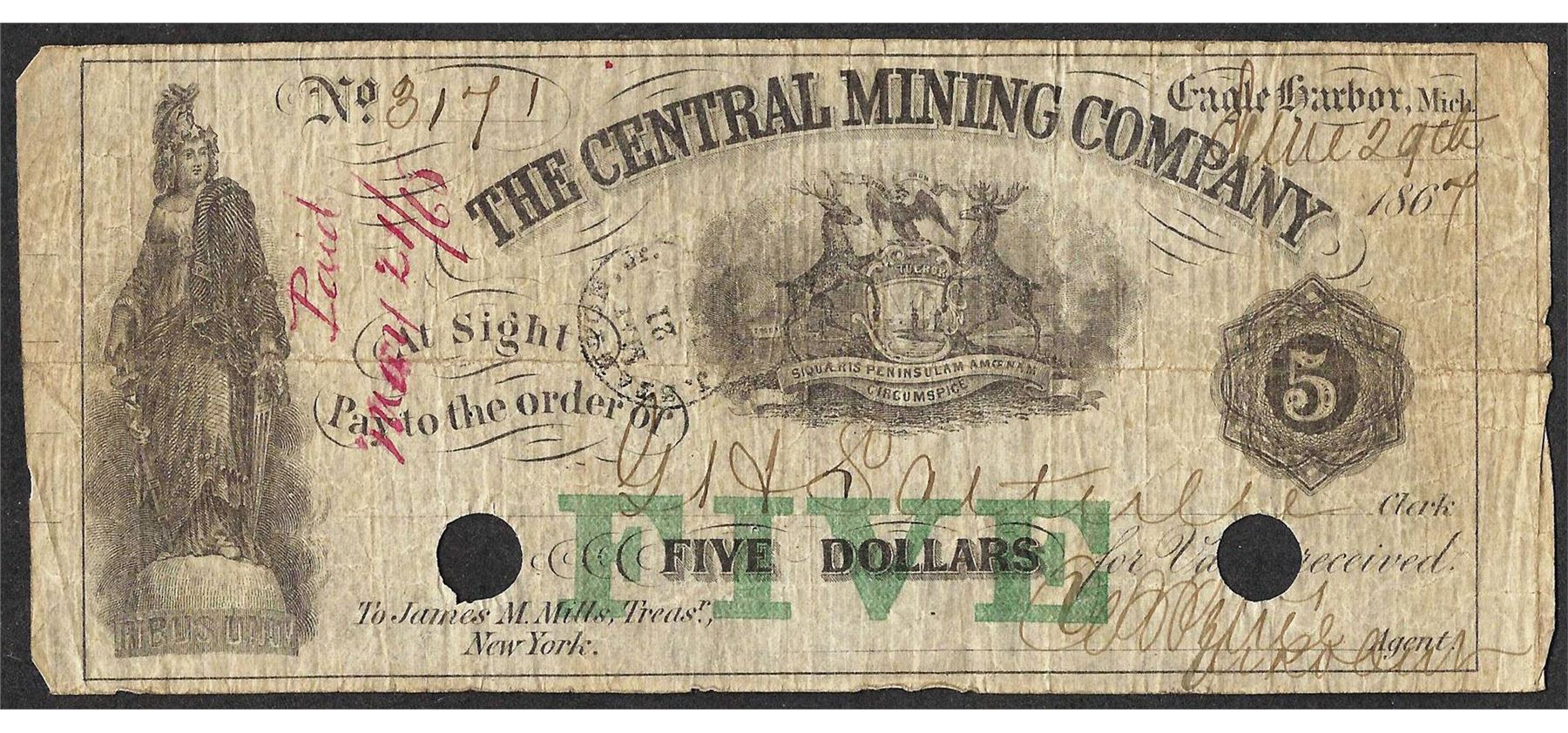 1864 $5 The Central Mining Company Eagle Harbor, Michigan Obsolete Note