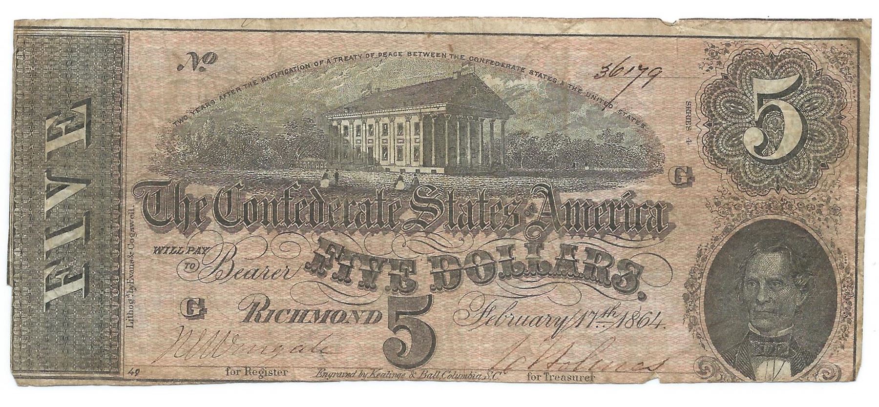 One 1864 $5 The Confederate States of America Note T-69 CC