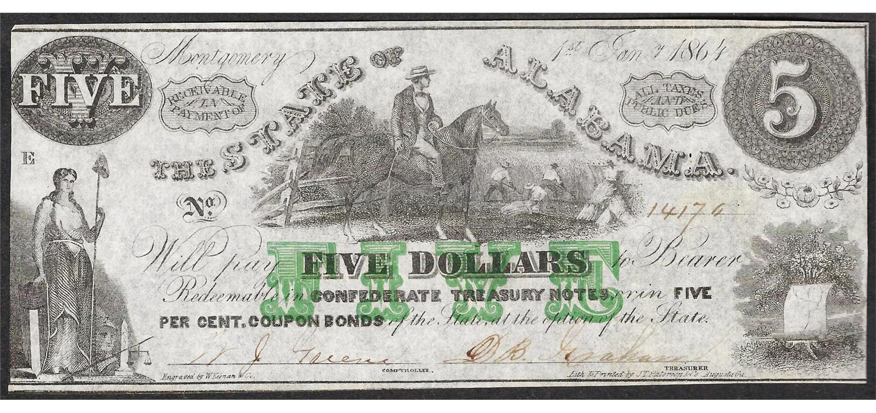 One 1864 $5 The State of Alabama Confederate Treasury Note.