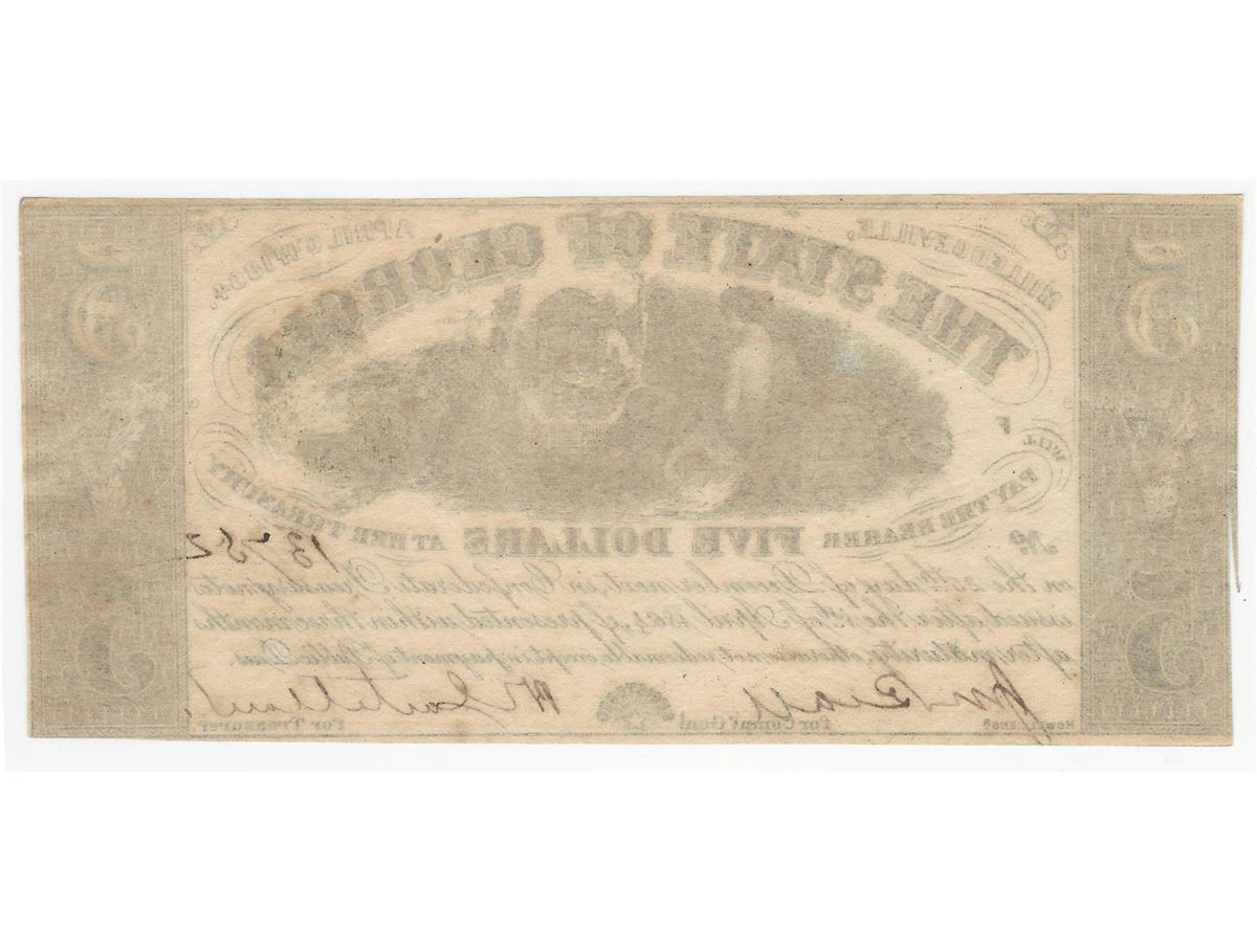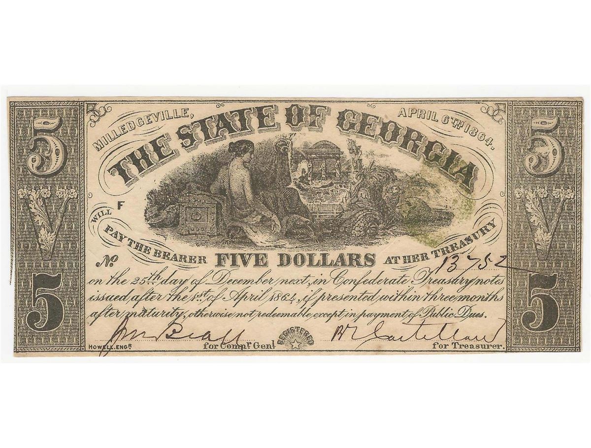 One 1864 $5 The State of Georgia Confederate Treasury Note.
