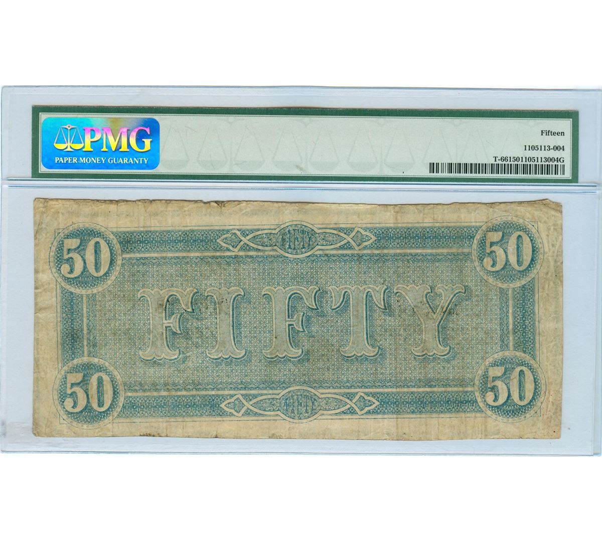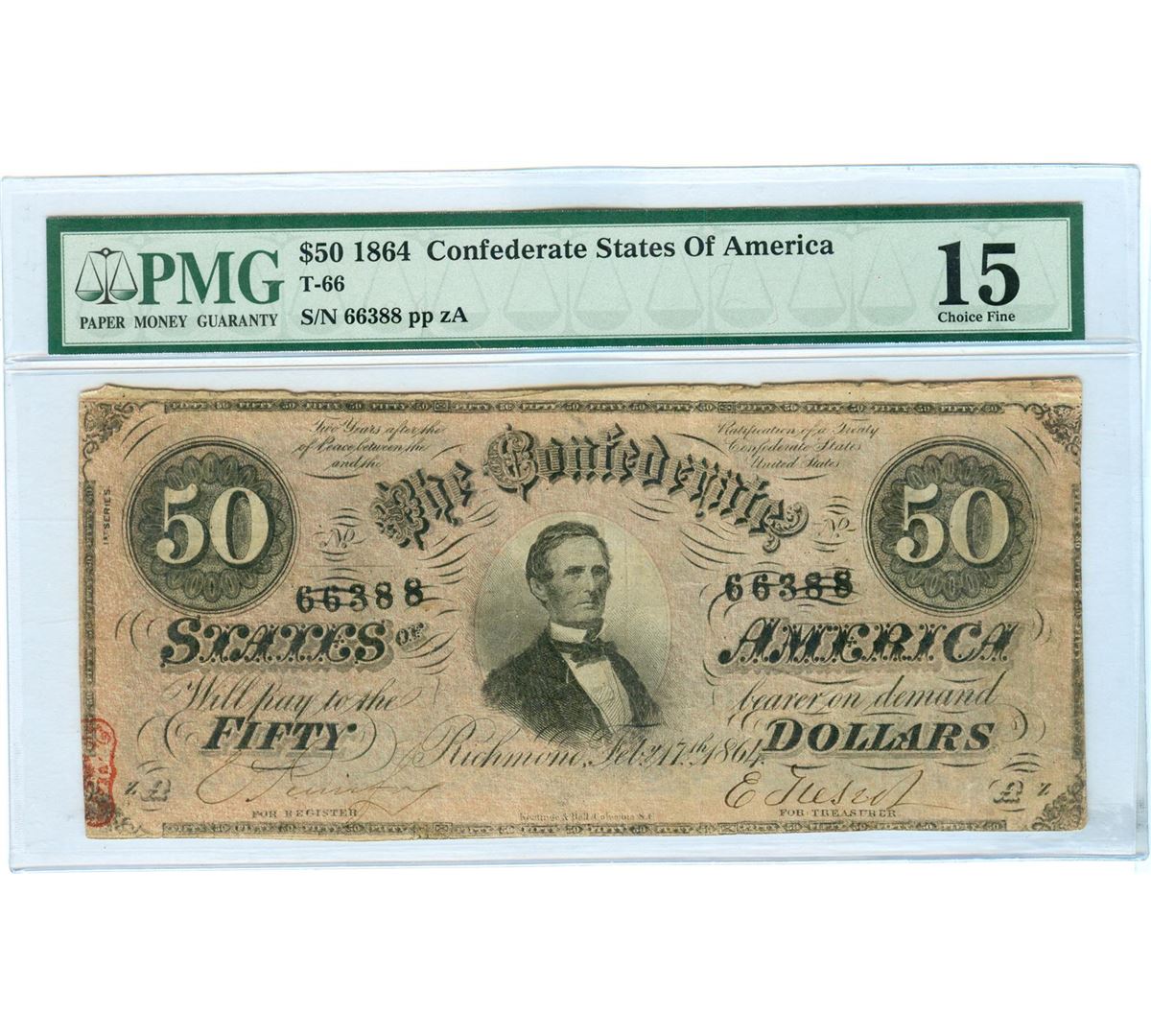 One 1864 $50 Confederate States of America Bank Note T-66 PMG Graded Choice Fine 15.