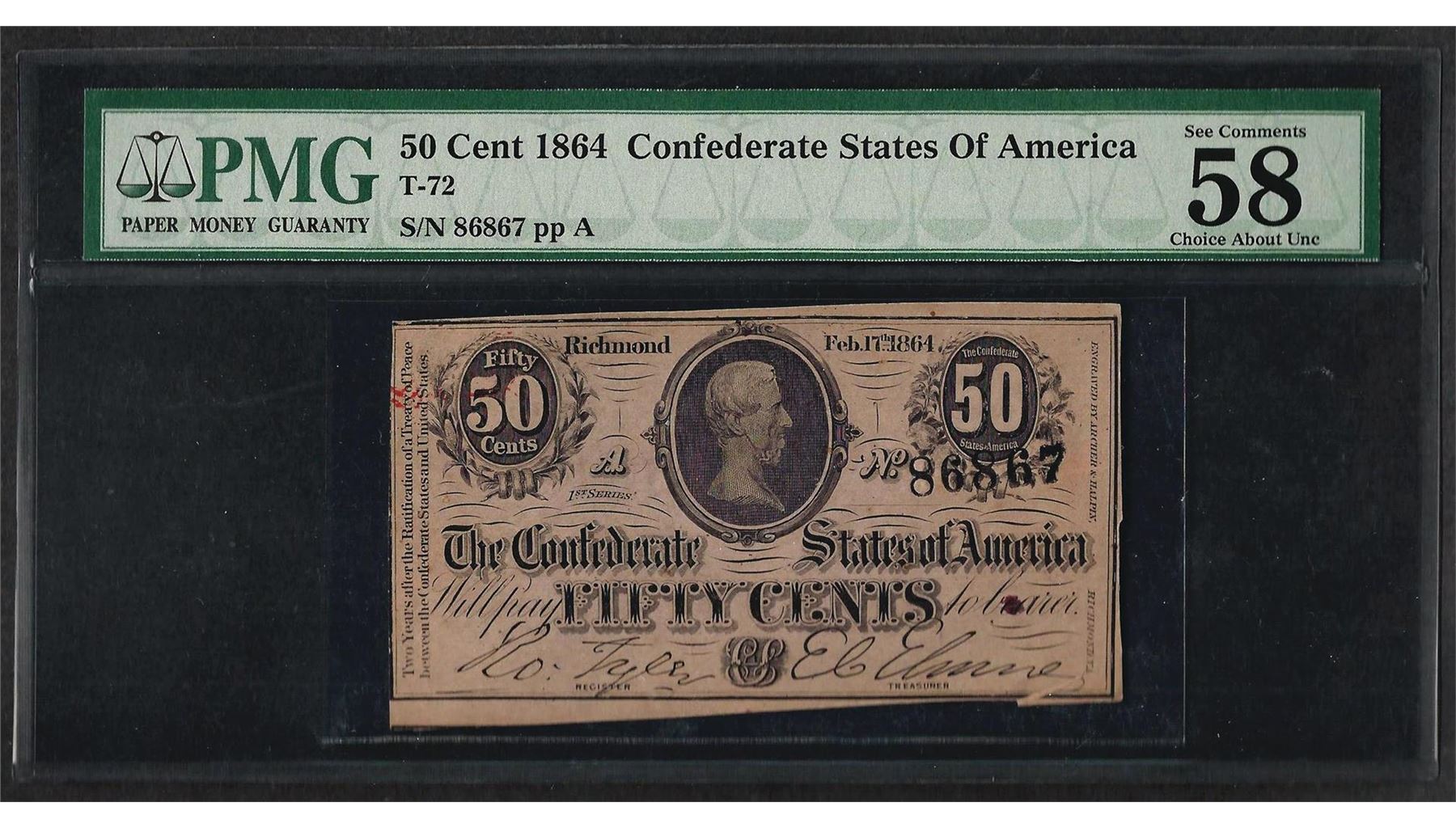 One 1864 50 Cents Confederate States of America Note PMG Choice About Uncirculated 58EPQ. PMG Certified.