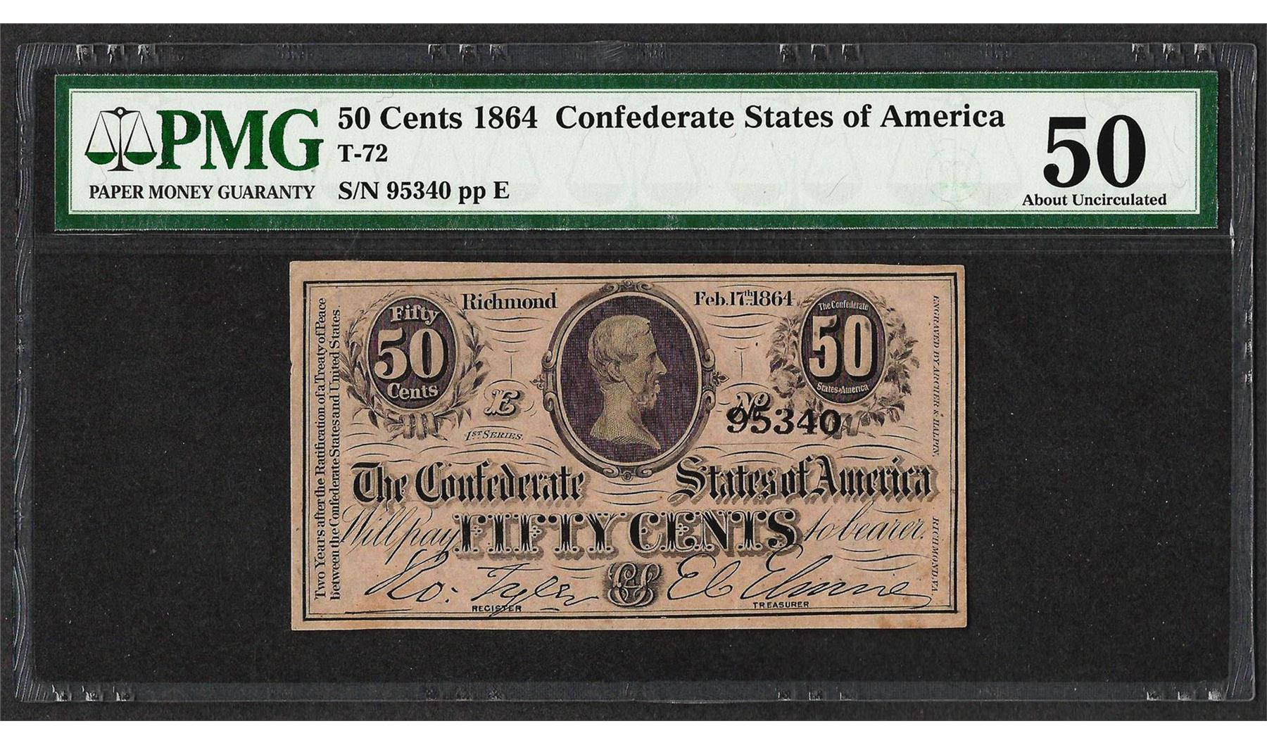 One 1864 50 Cents Confederate States of America Note T-72 PMG About Uncirculated 50. PMG Certified.