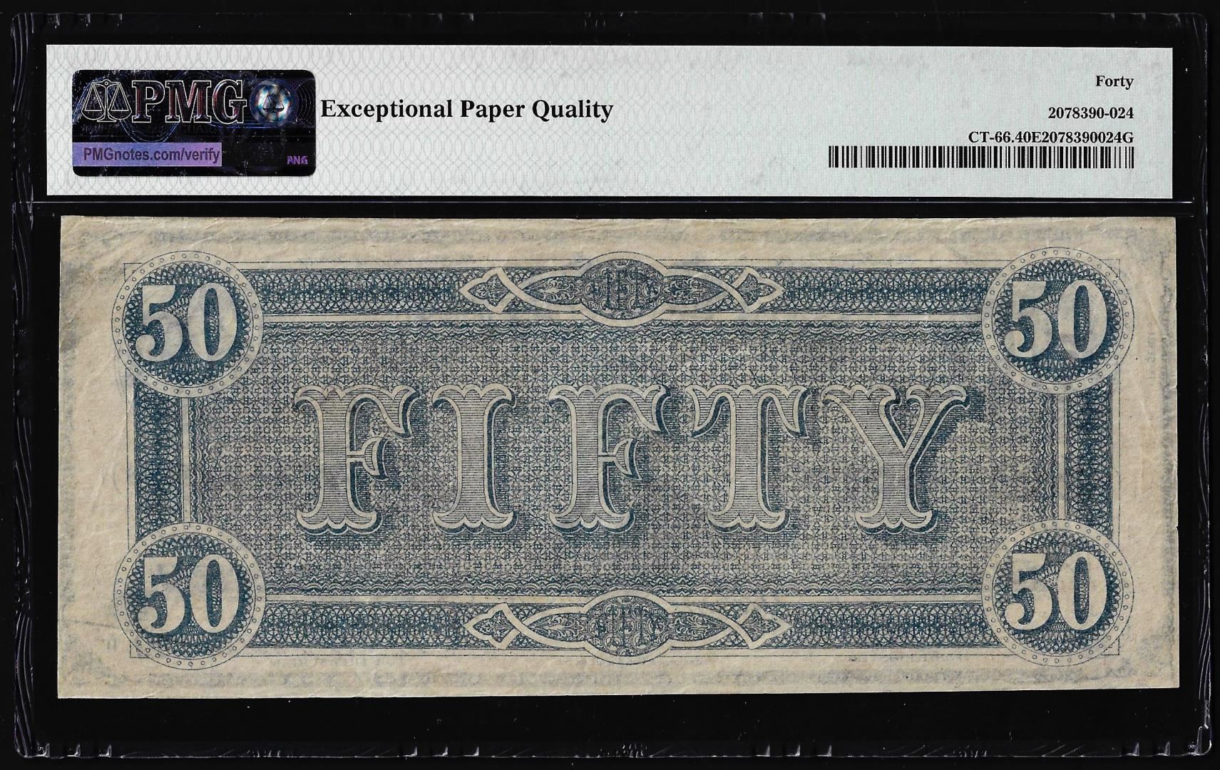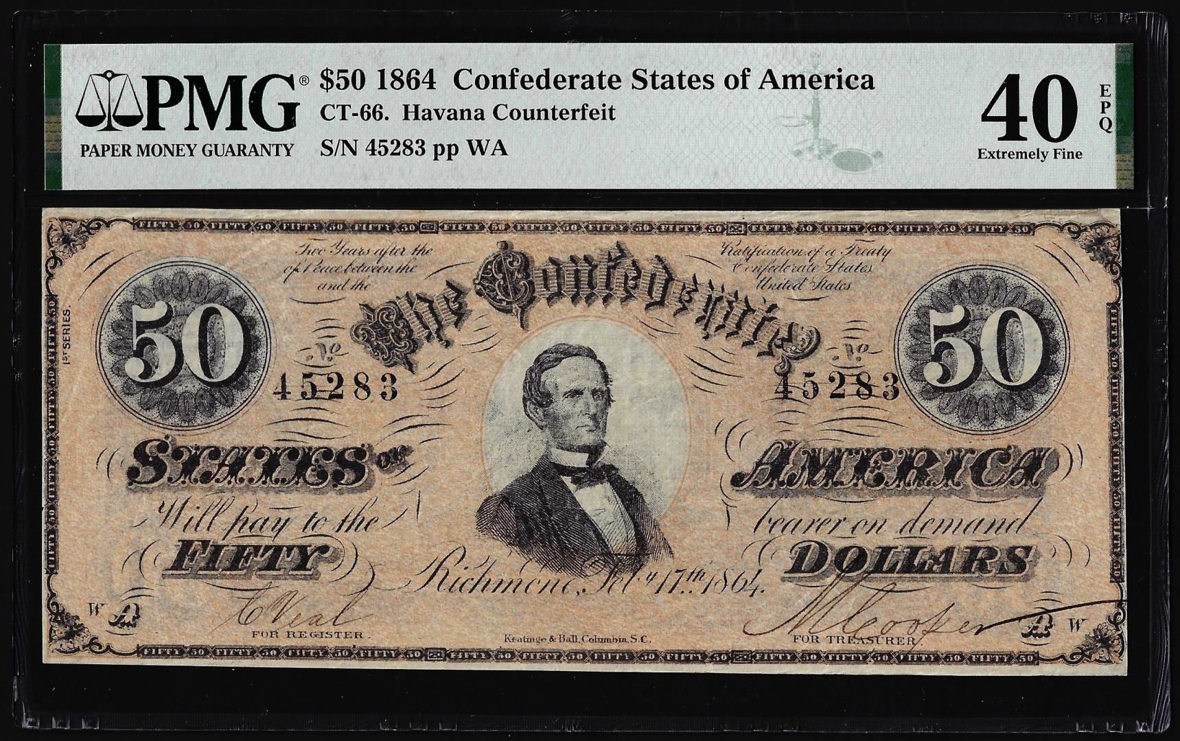 One 1864 $50 Confederate States Havana Counterfeit Note CT-66 PMG Extremely Fine 40EPQ. PMG Certified.