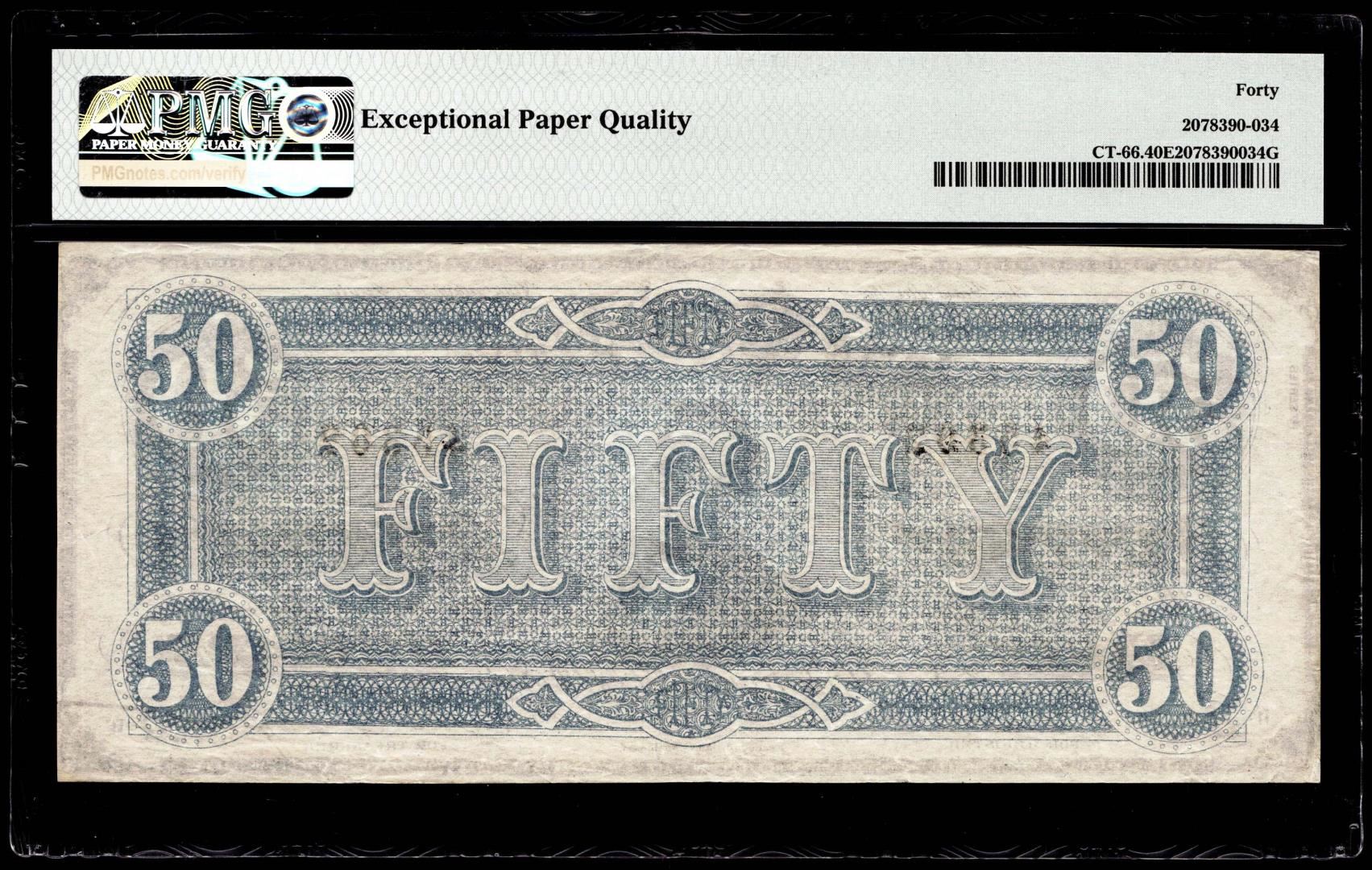 One 1864 $50 Confederate States Havana Counterfeit Note CT-66 PMG Extremely Fine 40EPQ. PMG Certified.