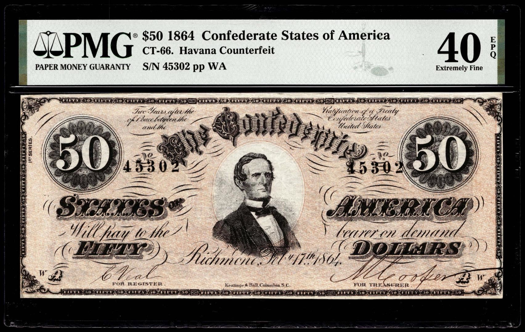 One 1864 $50 Confederate States Havana Counterfeit Note CT-66 PMG Extremely Fine 40EPQ. PMG Certified.
