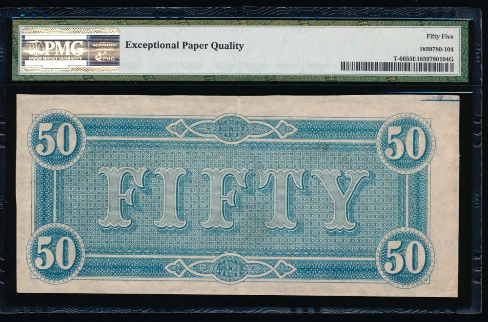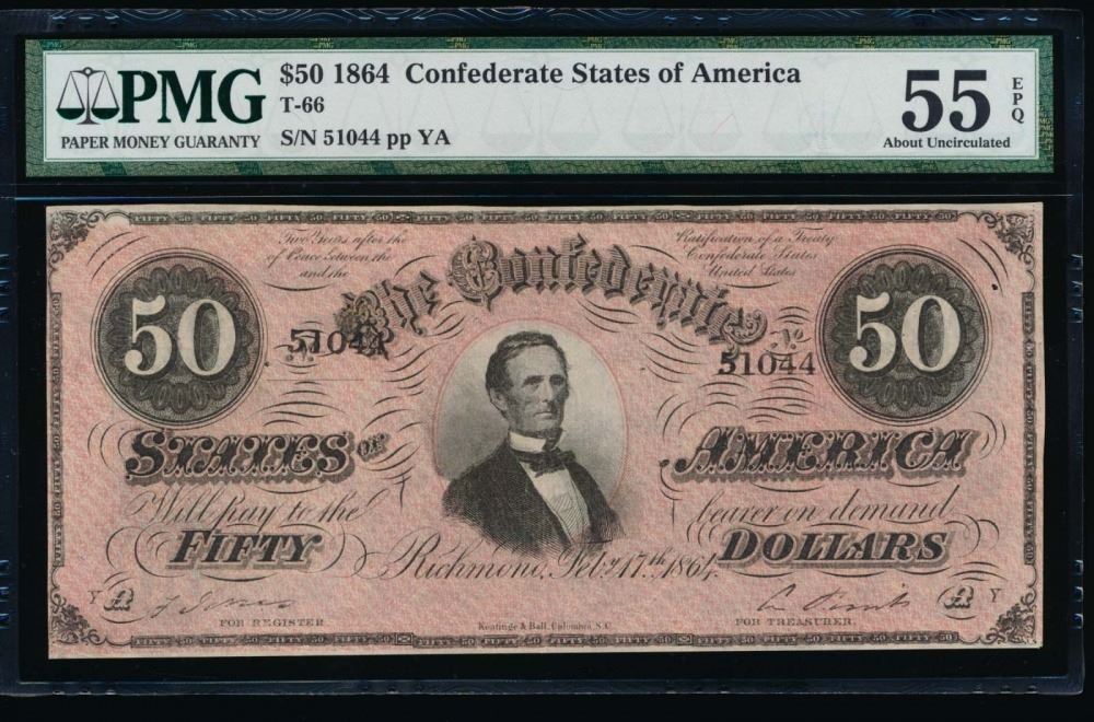 One 1864 $50 Confederate States of America Note PMG 55EPQ.