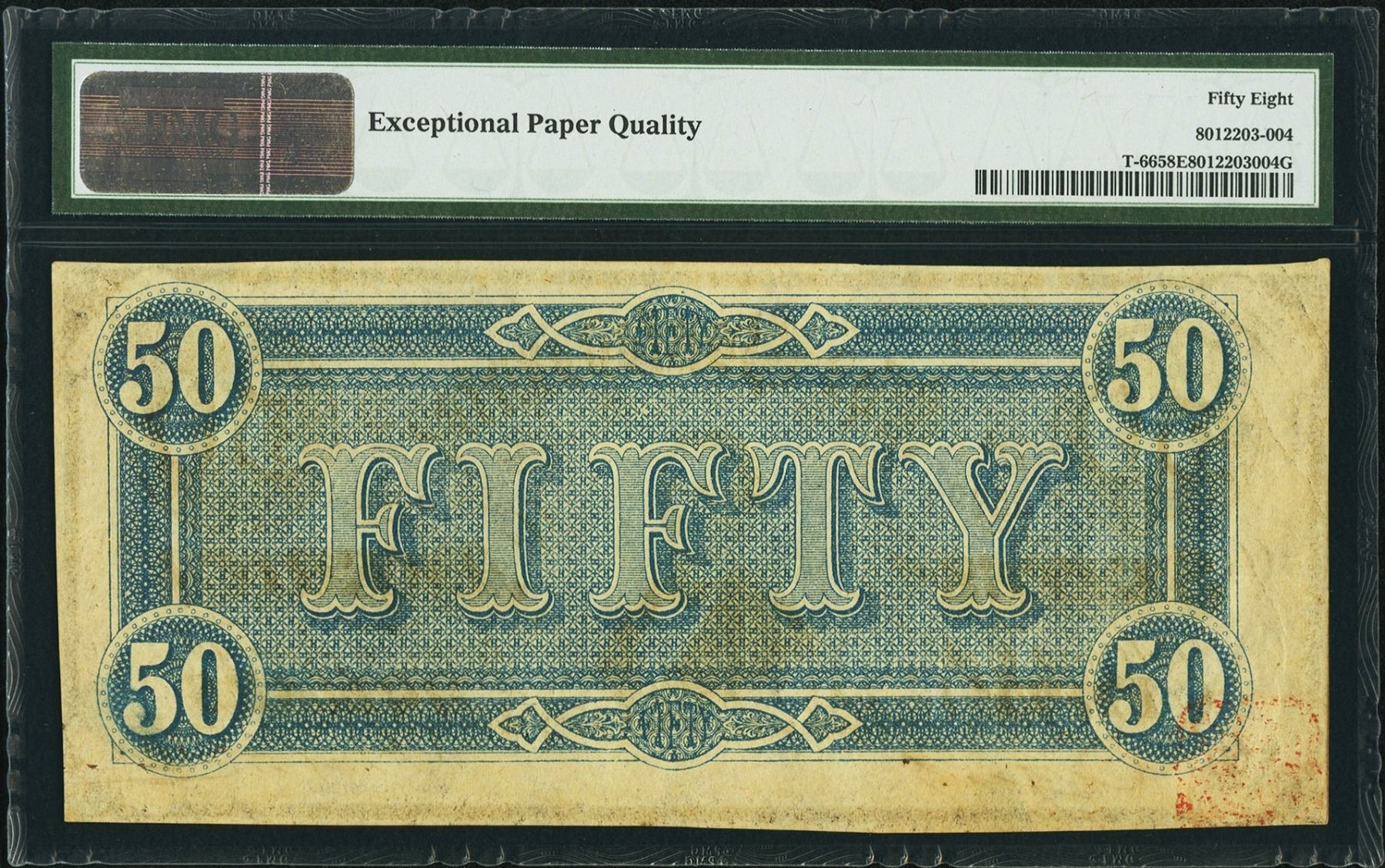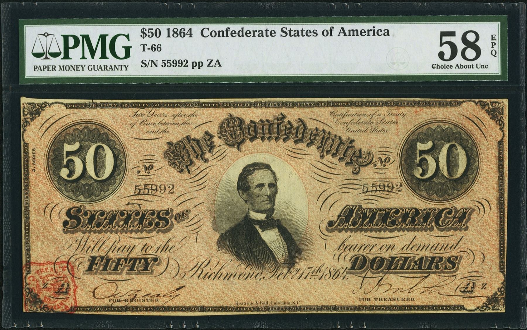 One 1864 $50 Confederate States of America Note PMG 58EPQ.