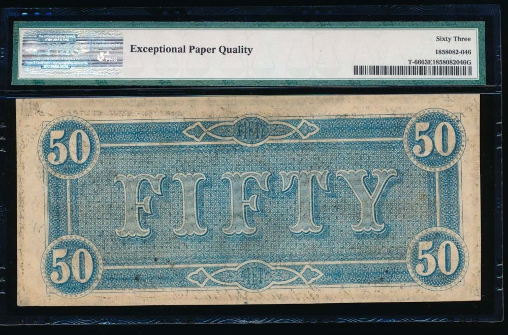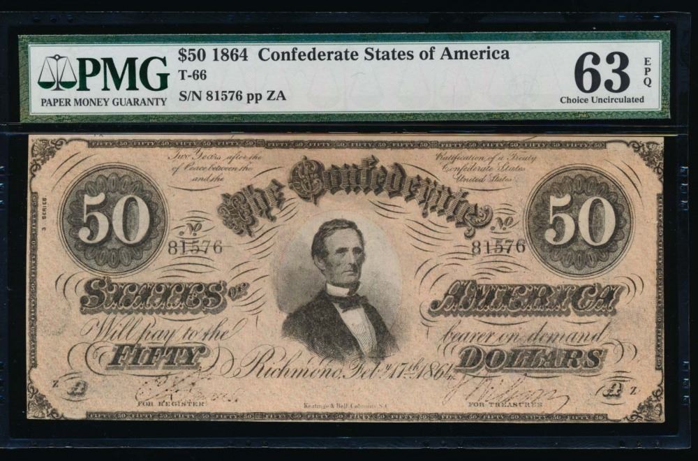 One 1864 $50 Confederate States of America Note PMG 63EPQ.