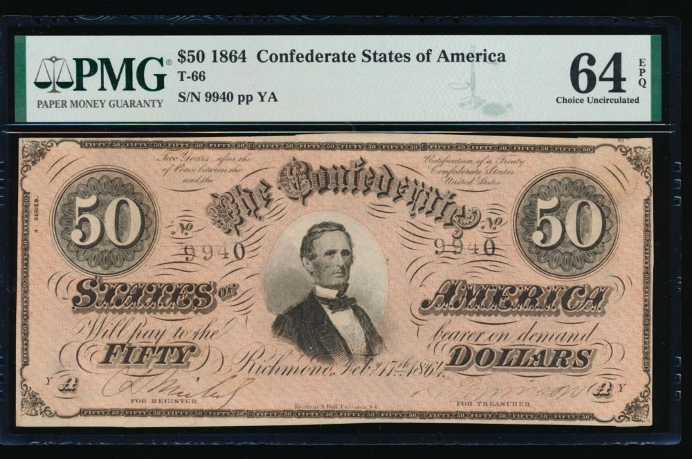 One 1864 $50 Confederate States of America Note PMG 64EPQ.