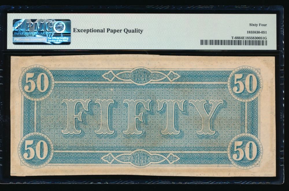 One 1864 $50 Confederate States of America Note PMG 64EPQ.