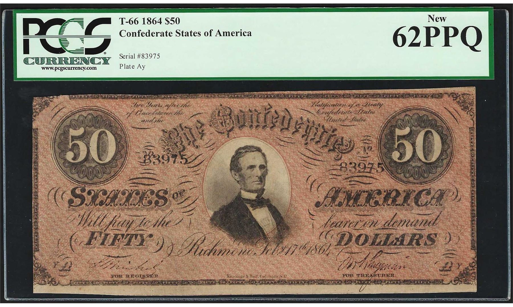 One 1864 $50 Confederate States of America Note T-66 PCGS New 62PPQ. PCGS Graded.