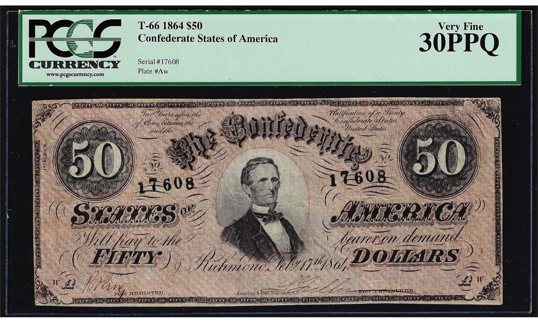 1864 $50 Confederate States of America Note T-66 PCGS Very Fine 30PPQ