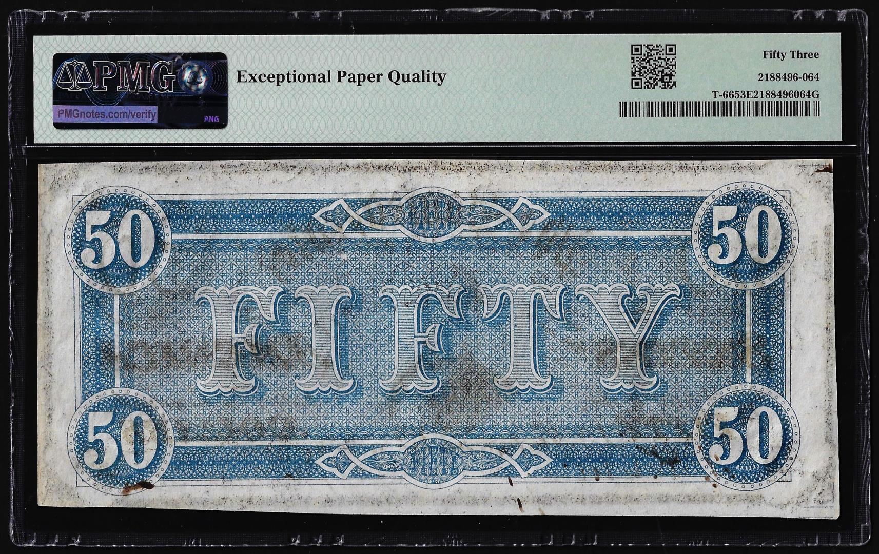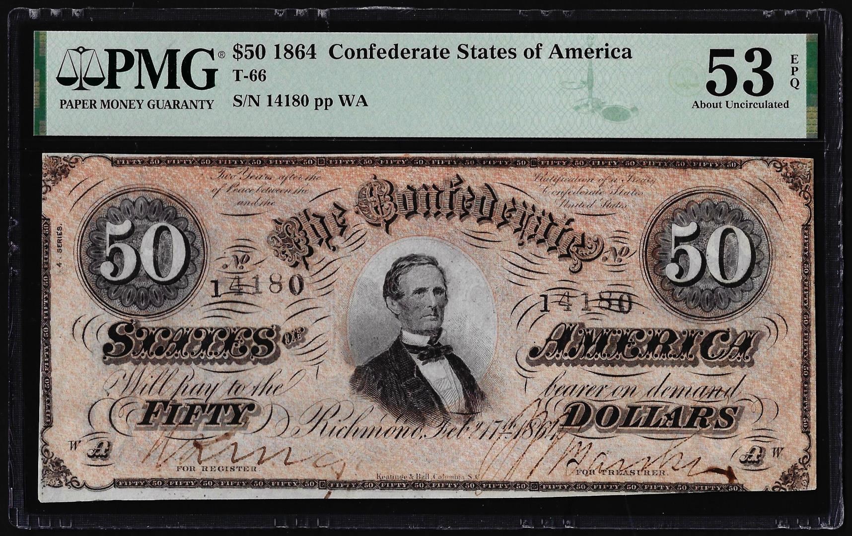 1864 $50 Confederate States of America Note T-66 PMG About Uncirculated 53EPQ