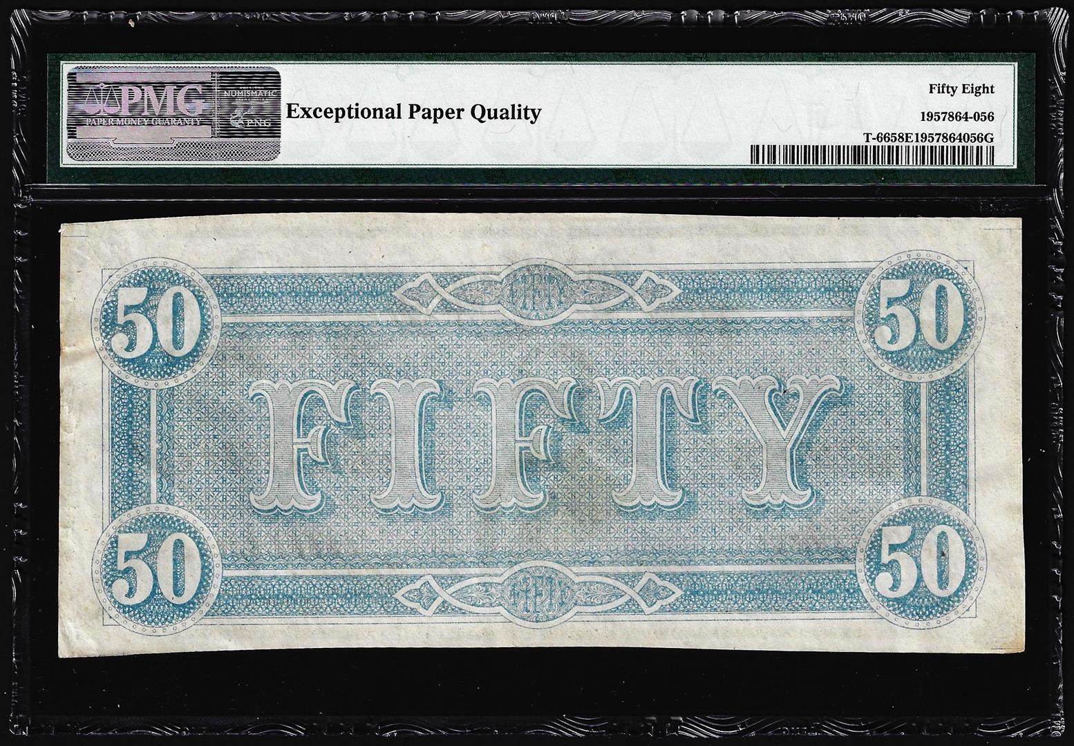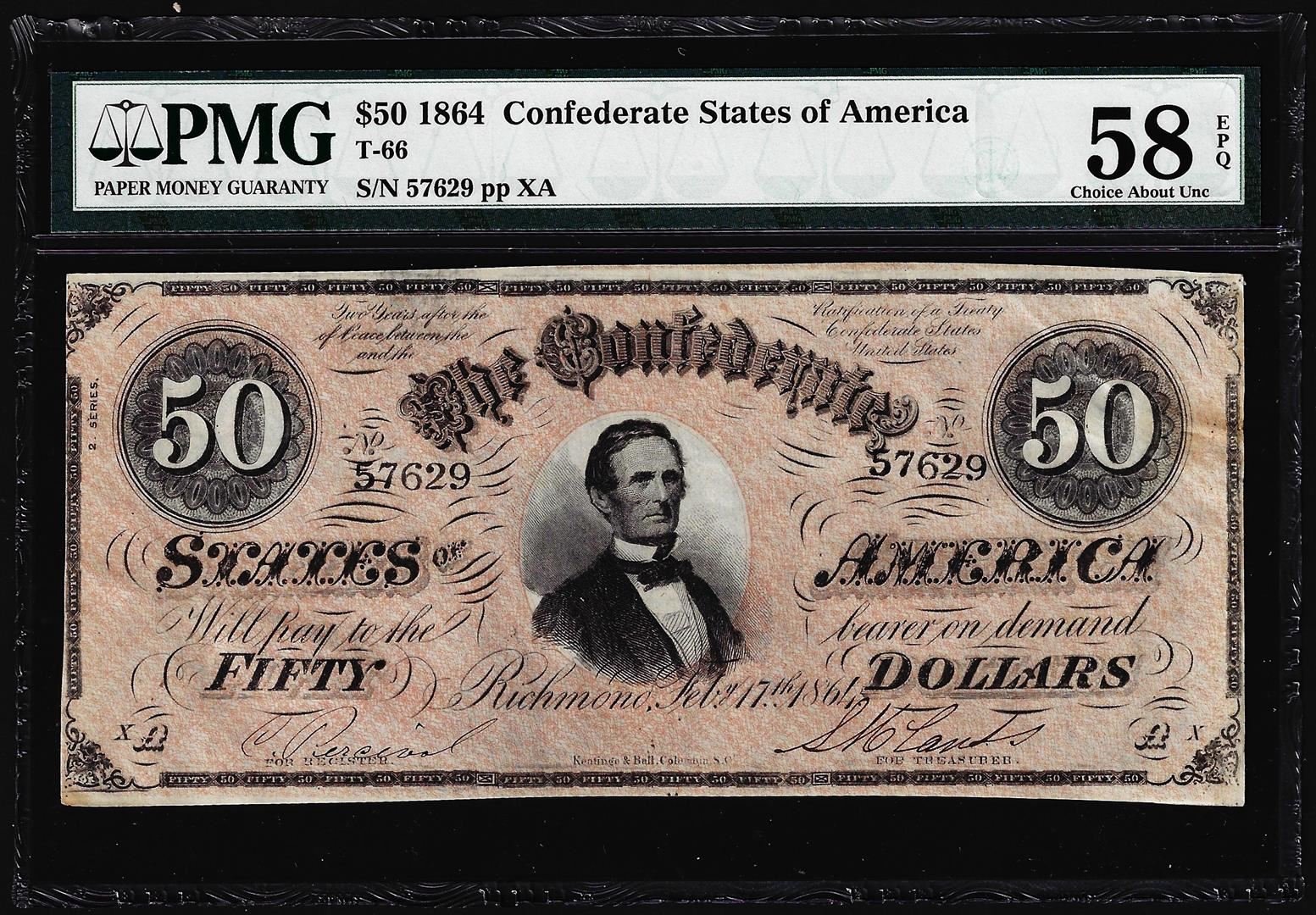 1864 $50 Confederate States of America Note T-66 PMG About Uncirculated 58EPQ