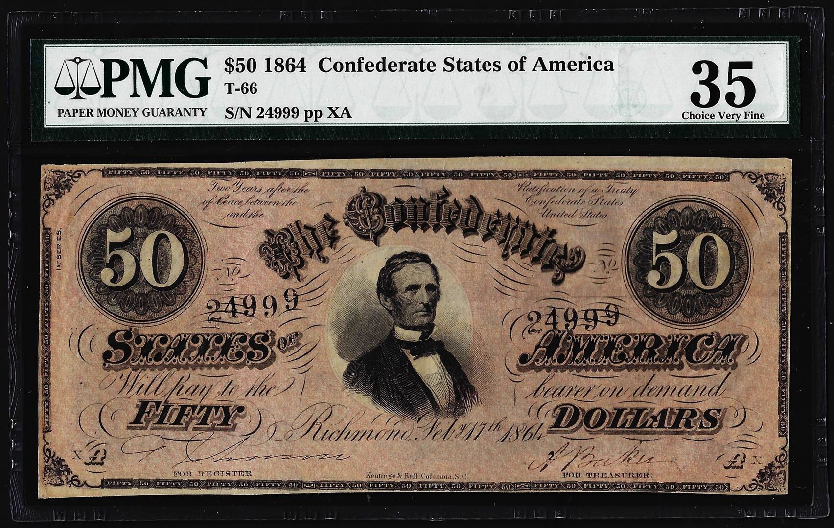 1864 $50 Confederate States of America Note T-66 PMG Choice Very Fine 35