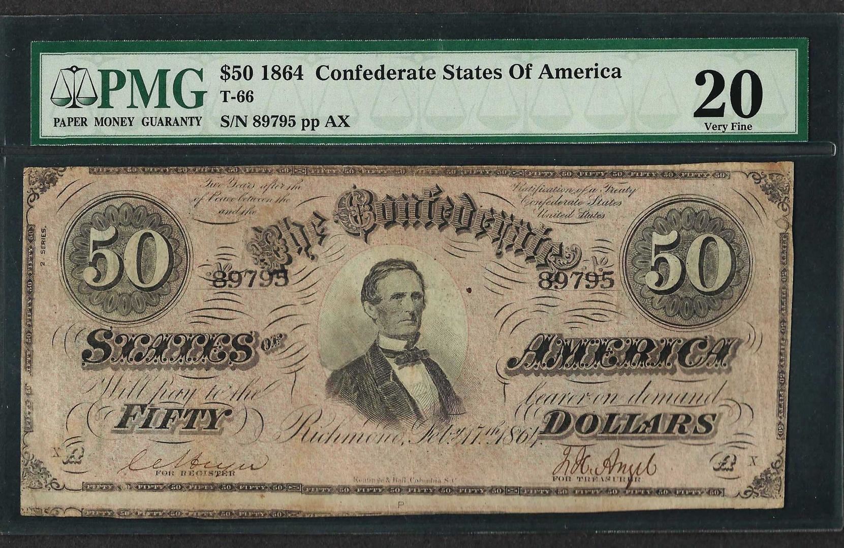 One 1864 $50 Confederate States of America Note T-66 PMG Very Fine 20. PMG Certified.