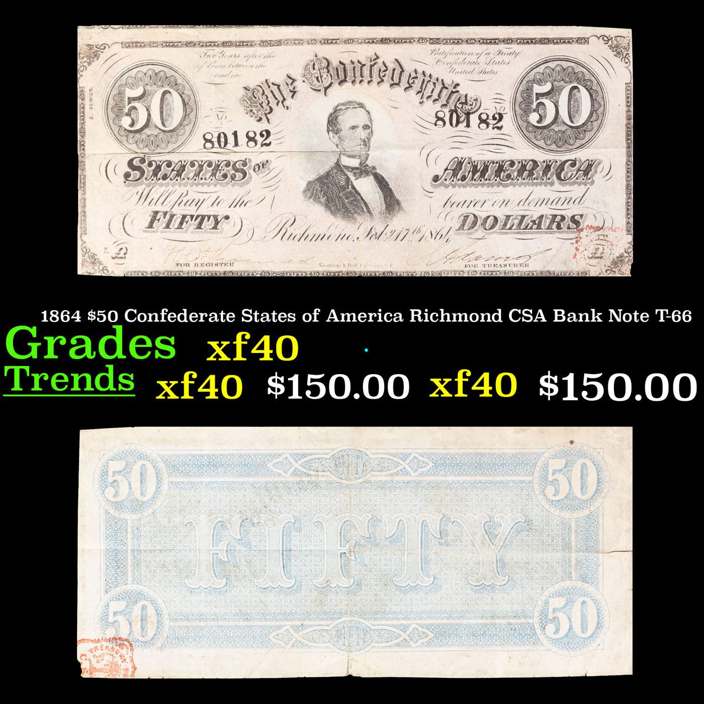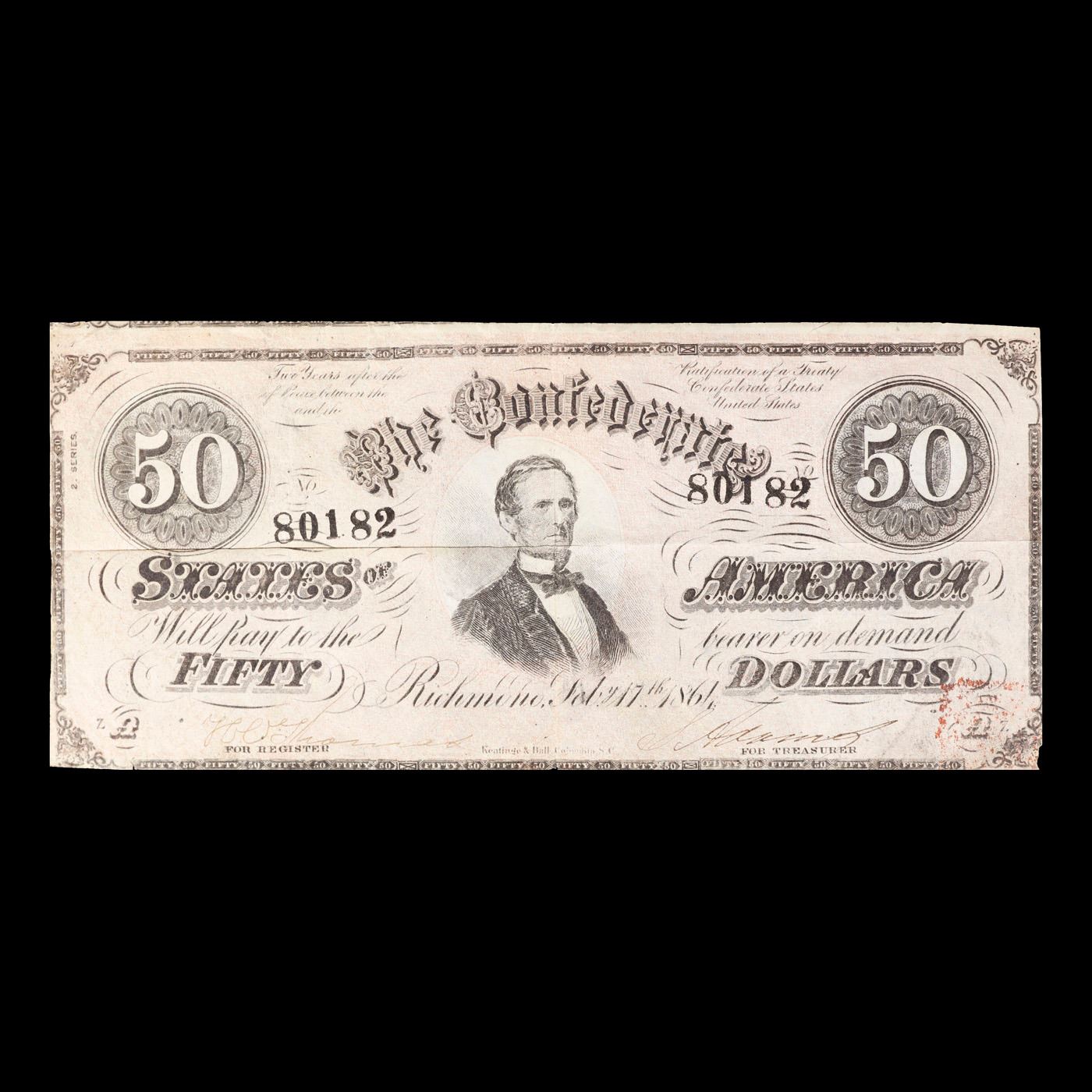 1864 $50 Confederate States of America Richmond CSA Bank Note T-66 Grades xf. After the Civil War broke out in 1861, the newly established Confederate government began to issue it's own money as legal tender to the citizens of the South. The gamble was that if the South won the war, the money would be redeemable. The 1st note from the Government of the Confederate States of America was issued in April of 1861. From then on, notes were issued on through 1864. Almost every Confederate note was painstakingly hand signed and numbered. It is not uncommon for these notes to have uneven, or rough borders since scissors or shears were used to hastily cut the sheets of notes apart.