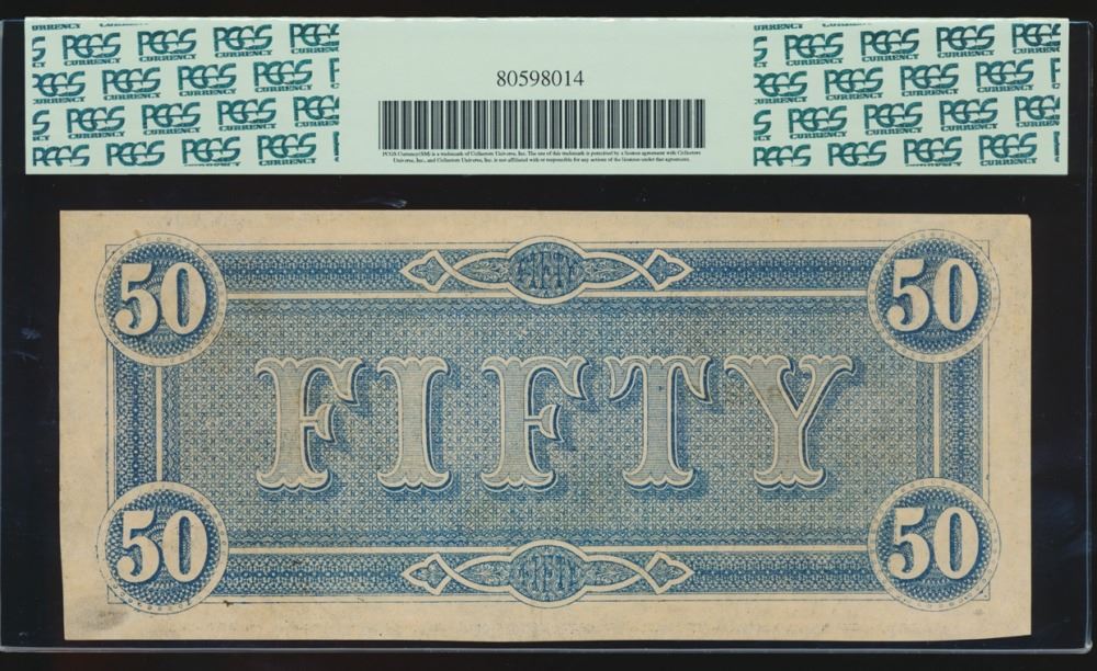 One 1864 $50 Confederate States of American Note PCGS 55PPQ.