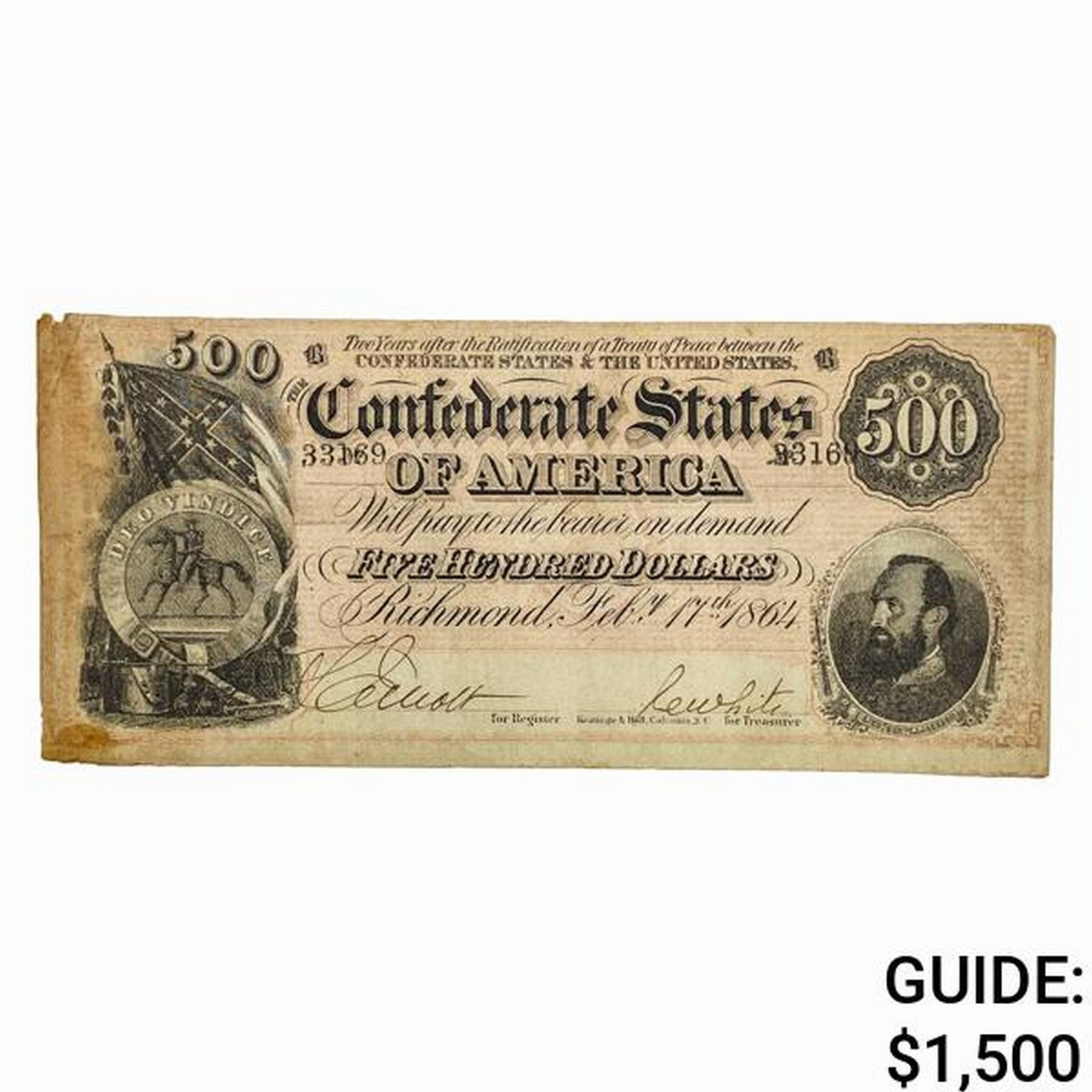 1864 $500 CSA CONFEDERATE DIXIE REBEL NOTE EF