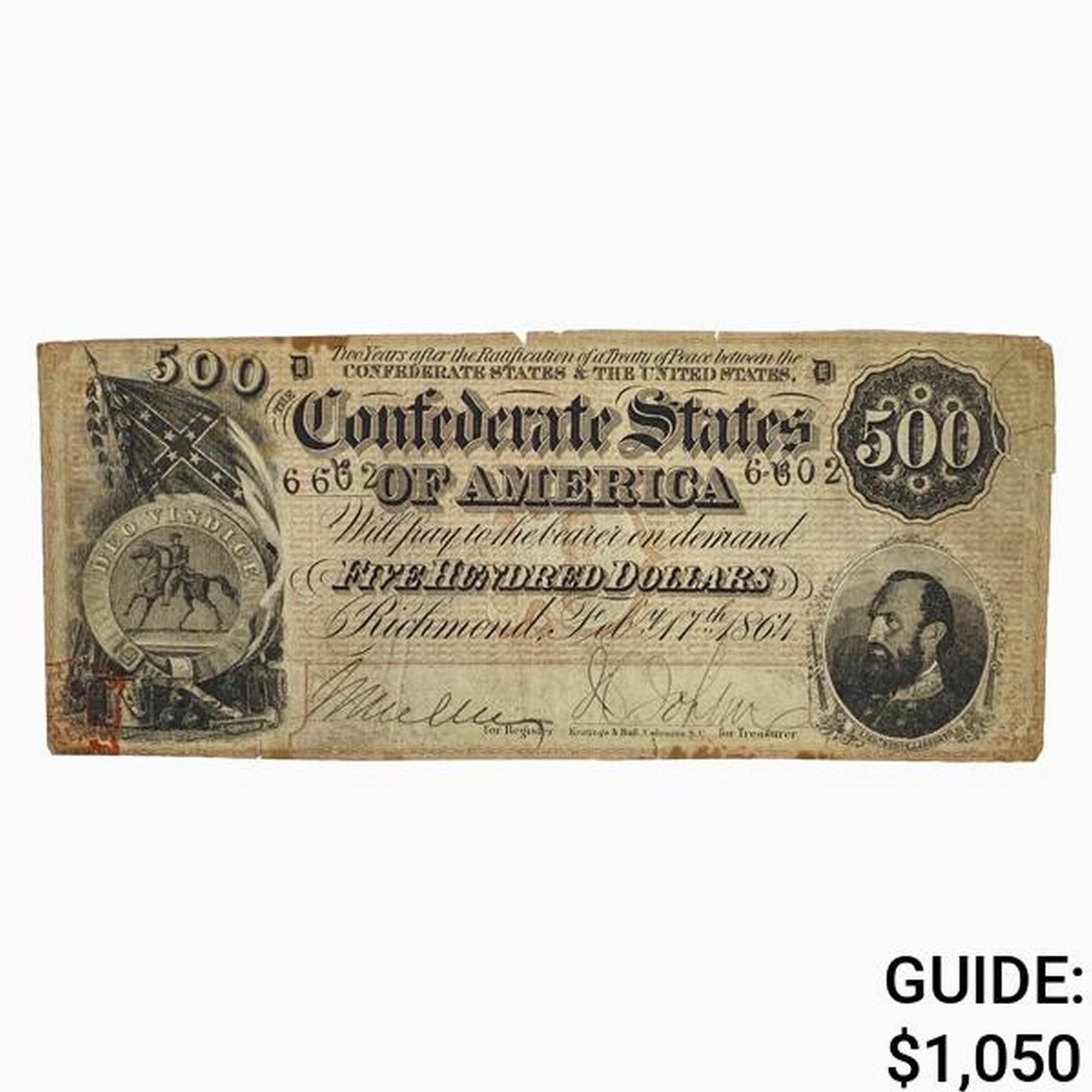 1864 $500 CSA CONFEDERATE DIXIE REBEL NOTE VF