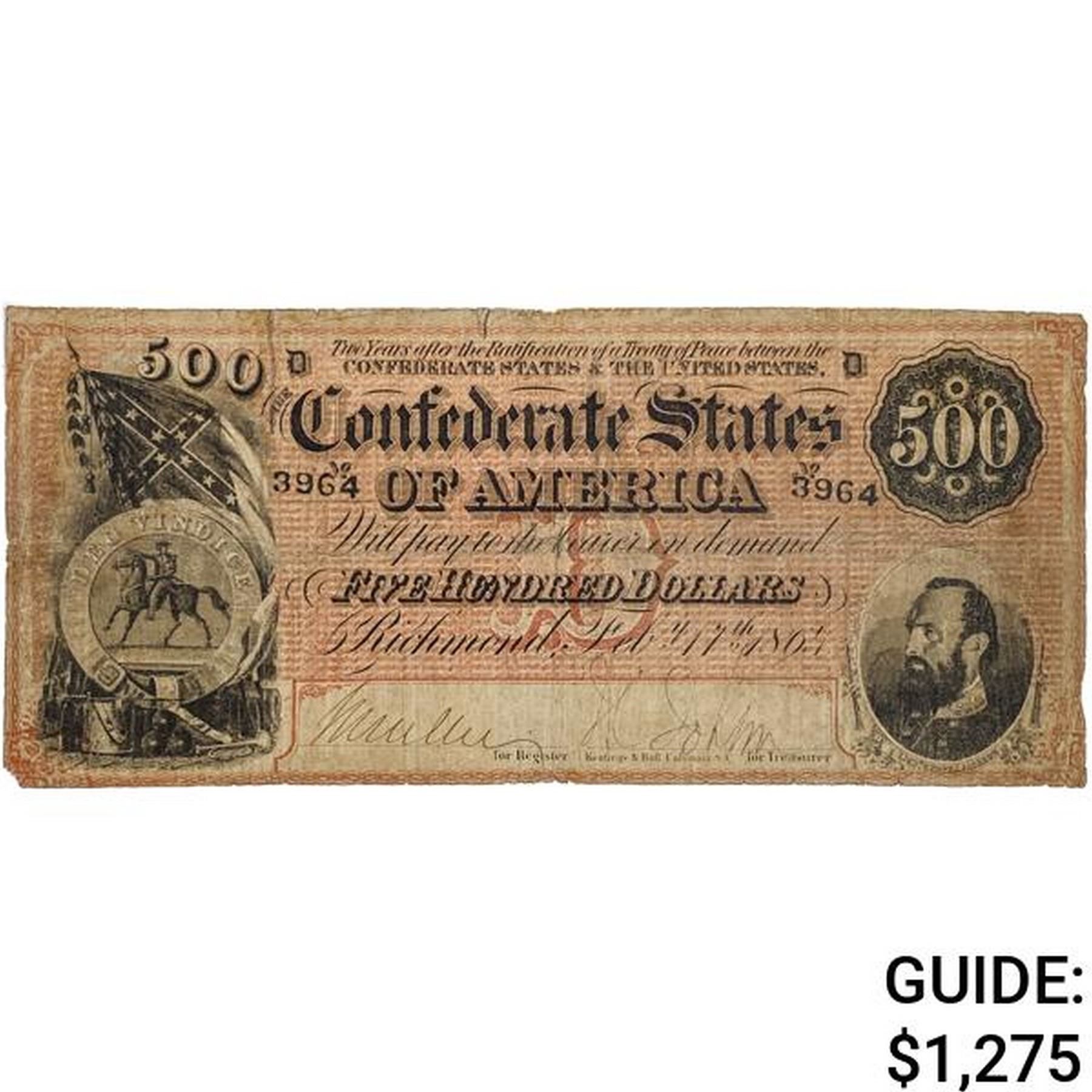 1864 $500 CSA CONFEDERATE DIXIE REBEL NOTE VF