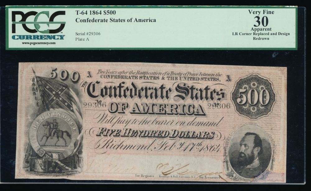One 1864 $500 Confederate States of America Note PCGS 30.