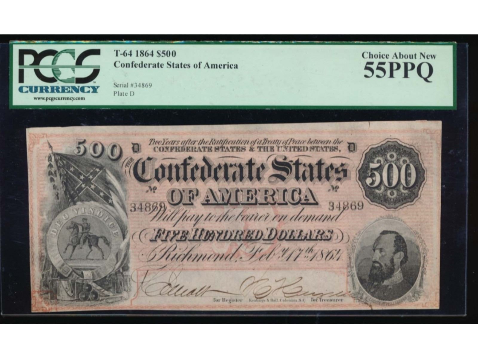 One 1864 $500 Confederate States of America Note PCGS 55PPQ.