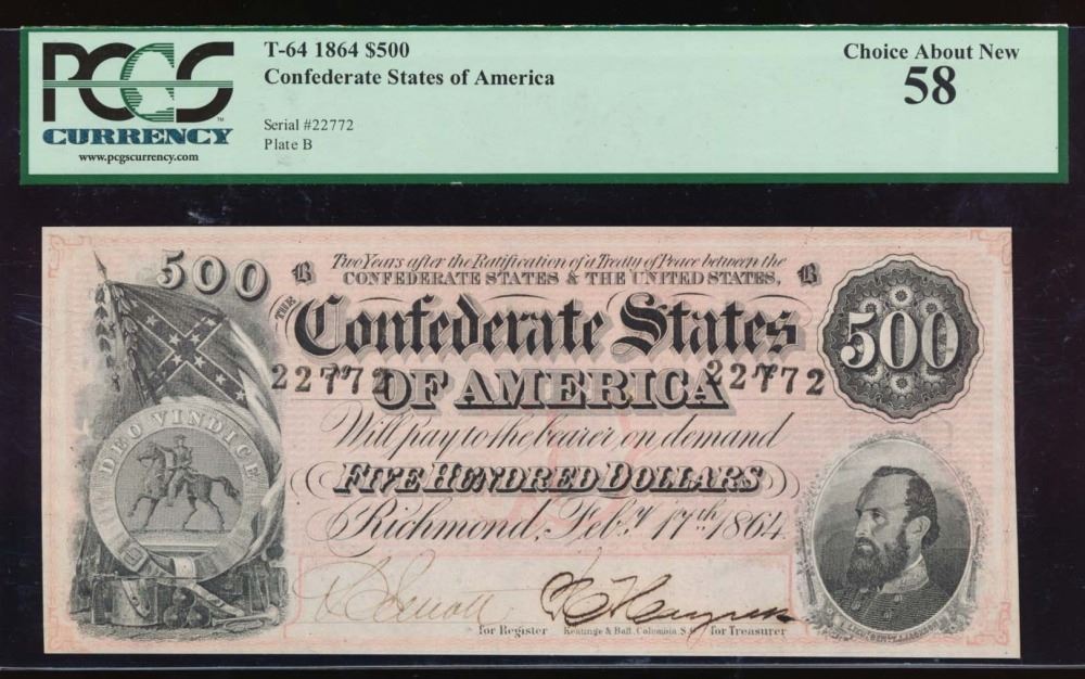 One 1864 $500 Confederate States of America Note PCGS 58.