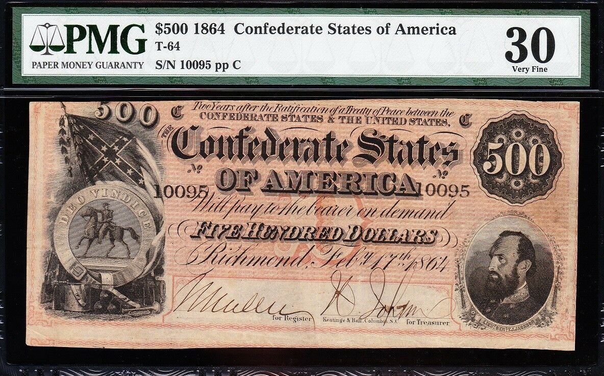 One 1864 $500 Confederate States of America Note PMG 30.