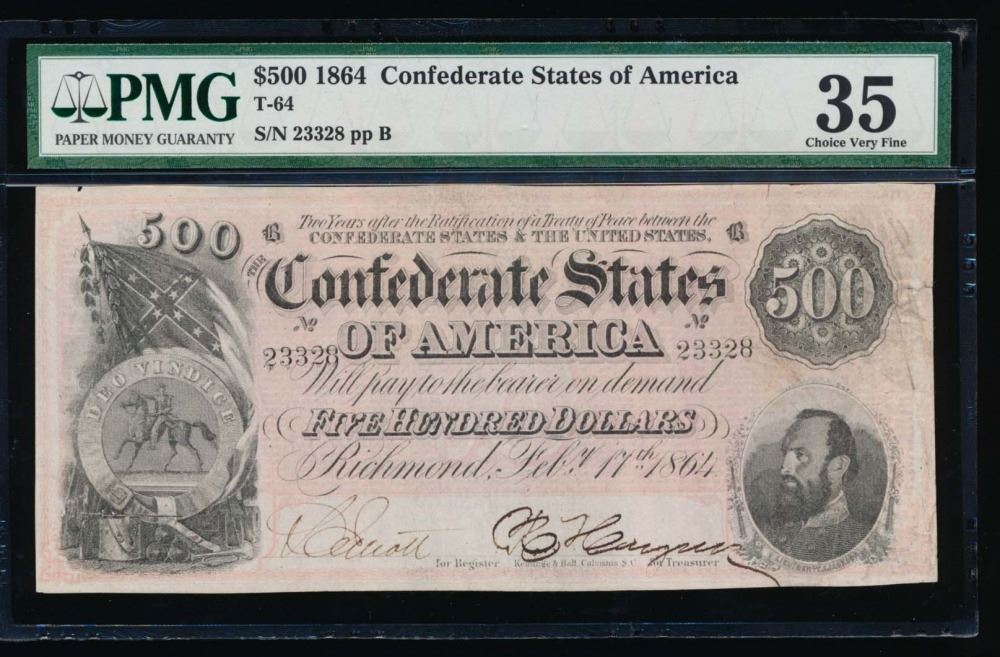 One 1864 $500 Confederate States of America Note PMG 35.
