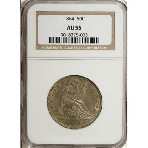 <B>1864 50C AU55 NGC.</B></I> A scarce civil War issue, traces of luster reside in the recesses of this light golden-gray representative. Clean surfaces exhibit sharply struck design elements. A light crack connects the outer edges of the first four stars.<B><BR></B></I><I>From The Beau Clerc Collection.</B></I><BR><BR><B>Coin Engraver:</B> Christian Gobrecht<BR><BR><b>Shipping:</b> Coins & Currency (<a target="_blank" href="http://www.heritageauctions.com/common/shipping.php">view shipping information</a>)