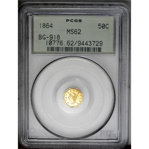 <B>1864<50C> Liberty Octagonal 50 Cents, BG-918, R.4, MS62 PCGS.</B></I> A flashy and well struck prooflike piece with distributed faint field marks. Housed in a green label holder.