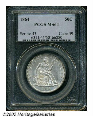<B>1864<50C> MS64 PCGS.</B></I> Boldly struck overall, with minor flatness evident on the top of Liberty's head, and on the upper pair of obverse stars, with bright, untoned, lustrous surfaces that have a pleasing satiny sheen and only display superficial marks on either side.