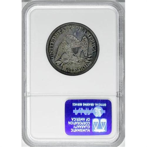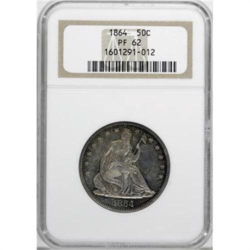 <B>1864 50C PR62 NGC.</B></I> Gold-green patina is dominant on the obverse, while the reverse shows ample sapphire toning as well. Decisively struck with excellent eye appeal despite the scattered hairlines and contact that account for the grade.<BR><BR><B>Coin Engraver:</B> Christian Gobrecht<BR><BR><b>Shipping:</b> Coins & Currency (<a target="_blank" href="http://www.heritageauctions.com/common/shipping.php">view shipping information</a>)