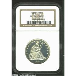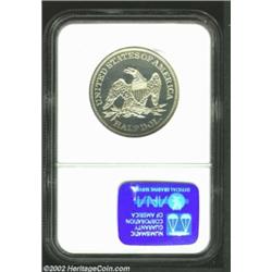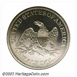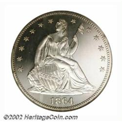 1864 50C PR64 Cameo NGC. The 1864 is one of the heavily melted and exported issues from the Civil War and as such is one of the scarcest P-mint issues in the No Motto series. This, of course, puts date pressure on the few remaining proofs, adding to their desirability to collectors. Brilliant throughout, the devices are noticeably frosted and contrast sharply against the depth of mirrored reflectivity in the fields. Population: 4 in 64, 1 finer (7/02). Important notice: We expect to be auctioning lots at the rate of 200-250 per hour. Sometimes eBay Premier live bid software cannot keep up with that pace, so we strongly recommend that you place a realistic proxy bid now as insurance to avoid disappointment. Also please note that all Heritage/CAA lots purchased through eBay Premier carry a 20% Buyer's Premium. Please make sure you read the Terms and Conditions.
