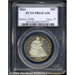 <B>1864<50C> PR64 Cameo PCGS.</B></I> Well mirrored with solid contrast accented by orange-gold peripheral toning. One of just 470 proofs struck in the final year of the Civil War, only a tiny percentage of which could match the appeal of this Choice specimen. Population: 4 in 64 Cameo, 0 finer (4/04). <BR><BR><B>Important notice:</B> Heritage usually auctions material at the rate of 200-250 lots per hour. On some occasions eBay Live bid software or the Internet may not be able to keep up with the pace of the auction. We recommend placing a realistic absentee bid now as insurance to avoid disappointment. Occasionally the auctioneer may eliminate or reject an eBay Live bid, and the auctioneer may also reopen a lot after the close of the eBay live bidding (usually because we missed an audience bid), and may reject your bid even if it shows you as the winning bidder. By bidding via eBay Live, you agree that Heritage may award the lot to another bidder at its sole discretion under the circumstances described above or any other reasonable circumstances. Since eBay bids are not shown to us until we open the lot on the floor, we treat those bids just like floor bids. In most cases the floor responds before the eBay bid is presented to us, due to Internet lag time, so for consistency we have made it a policy that floor bids are always considered first over tie eBay live bids. Also please note that all Heritage lots purchased through eBay Live carry a 20% Buyer's Premium. Please make sure you read the Terms and Conditions before you bid.