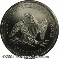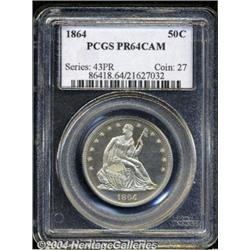 <B>1864<50C> PR64 Cameo PCGS.</B></I> The 1864 is one of the heavily melted and exported issues from the Civil War, and as such is one of the scarcest P-mint issues in the No Motto series. This, of course, puts date pressure on the few remaining proofs, adding to their desirability to collectors. Brilliant throughout, the devices are noticeably frosted and contrast sharply against the depth of mirrored reflectivity in the fields. No bothersome contact marks or planchet defects seem to be present, on either side of this impressive and visually fetching near-Gem. Thus far, only four pieces share the PR64 Cameo grade, and no coins have been graded above PR64, with the Cameo designation, by PCGS. Population: 4 in 64 Cameo, 0 finer (6/04).<BR><I>From The Willamette Collection.</B></I> <BR><BR><B>Important notice:</B> Heritage usually auctions material at the rate of 200-250 lots per hour. On some occasions eBay Live bid software or the Internet may not be able to keep up with the pace of the auction. We recommend placing a realistic absentee bid now as insurance to avoid disappointment. Occasionally the auctioneer may eliminate or reject an eBay Live bid, and the auctioneer may also reopen a lot after the close of the eBay live bidding (usually because we missed an audience bid), and may reject your bid even if it shows you as the winning bidder. By bidding via eBay Live, you agree that Heritage may award the lot to another bidder at its sole discretion under the circumstances described above or any other reasonable circumstances. Since eBay bids are not shown to us until we open the lot on the floor, we treat those bids just like floor bids. In most cases the floor responds before the eBay bid is presented to us, due to Internet lag time, so for consistency we have made it a policy that floor bids are always considered first over tie eBay live bids. Also please note that all Heritage lots purchased through eBay Live carry a 20% Buyer's Premium. Please make sure you read the Terms and Conditions before you bid. </span></font></tr></table></td></tr></table>