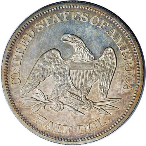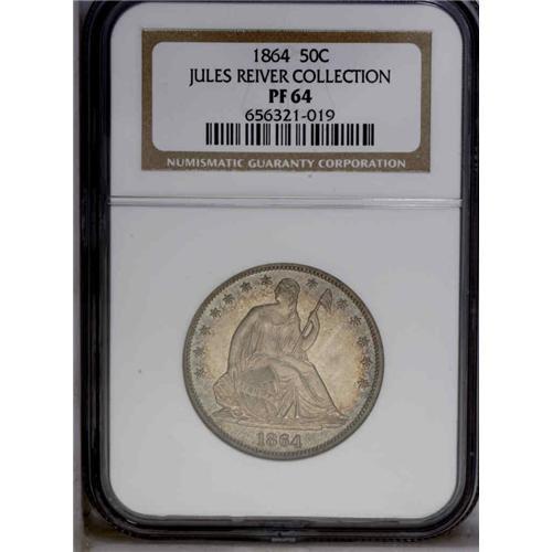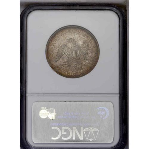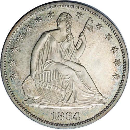 <B>1864<50C> PR64 NGC.</B></I> Dappled golden-brown and aquamarine colors grace this impressive Half Dollar, which is fully struck save for a trace of softness on the eagle's left (facing) ankle. Careful rotation beneath a light does not display any detectable hairlines. For this Civil War issue, a mere 470 proofs were produced, and high quality pieces are very scarce. Population: 47 in 64, 17 finer (9/05).