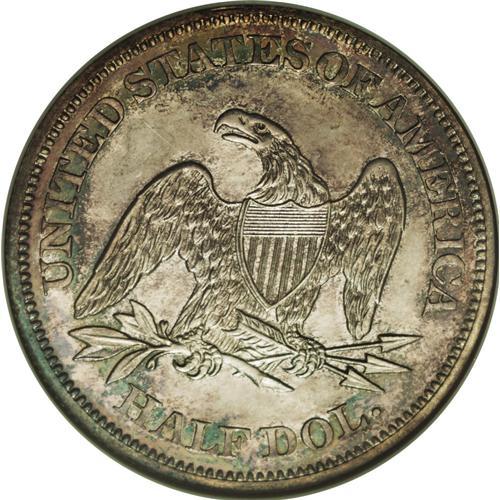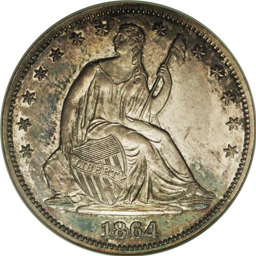1864 50C PR64 NGC. Dashes of sea-green, plum, and tan