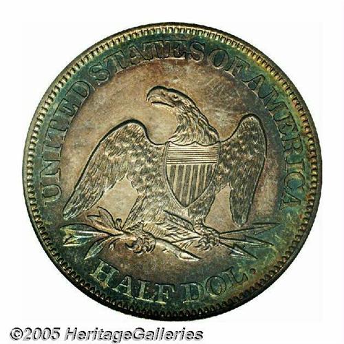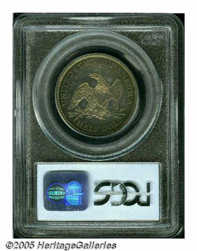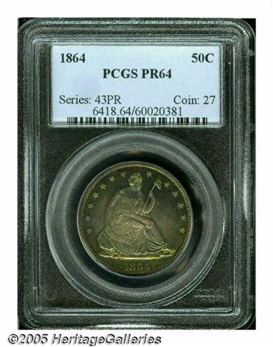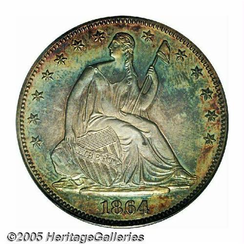 <B>1864<50C> PR64 PCGS.</B></I> Stunning iridescent toning blankets both sides of this exquisitely preserved, well struck near-Gem proof. The variegated obverse colors include crimson, russet, orange, yellow, and sea-green, while the reverse exhibits an even band of emerald-green peripheral patina, and deep amber color over the center. A noticeable contact mark in the left reverse field limits the grade, but the remaining surfaces seem free of handling marks or hairlines. A beautiful coin for the grade. Population: 48 in 64, 15 finer (6/05).<BR><I>From The Melrose Bay Collection.</B></I>