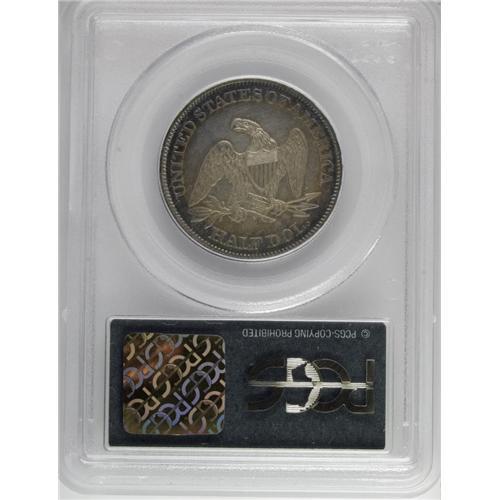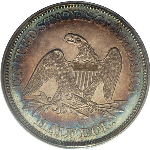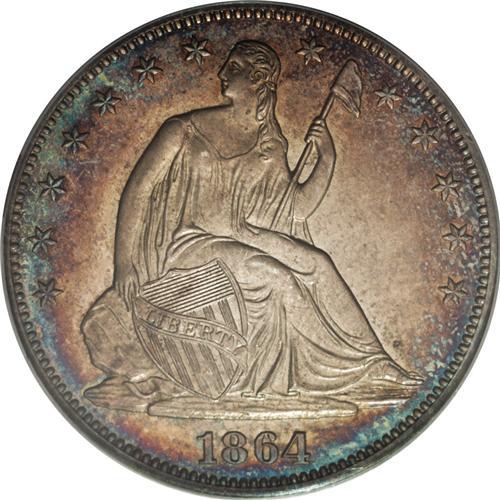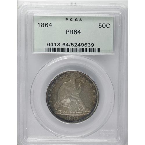 <B>1864 50C PR64 PCGS.</B></I> The 1864 proof half dollars come from a mintage of 470 pieces. This near-Gem displays dusky golden-gray patina in the centers that yields to golden-tan, cobalt-blue, and lavender at the margins. A powerful strike manifests itself in Liberty's hair, the sandal, the drapery, and the eagle's plumage. A few wispy handling marks do not disturb.<BR><BR><b>Shipping:</b> Coin/Currency (<a target="_blank" href="http://www.heritageauctions.com/common/shipping.php">view shipping information</a>)