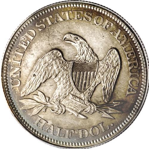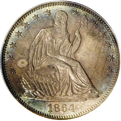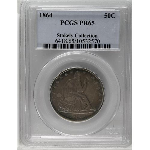 <B>1864<50C> PR65 PCGS.</B></I> Rich mauve, golden-brown, and ocean-blue coloration embraces this attractive Gem, whose sole defect is a subtle spot in the field near Liberty's shield hand. The strike is sharp, since all but the eagle's left (facing) ankle shows absolute detail. 470 proofs were struck for this scarce No Motto proof date. Population: 11 in 65, 4 finer (6/06).<BR><I>From The Stephen Stokely #1 PCGS Registry Set of Proof Seated Half Dollars.</B></I>