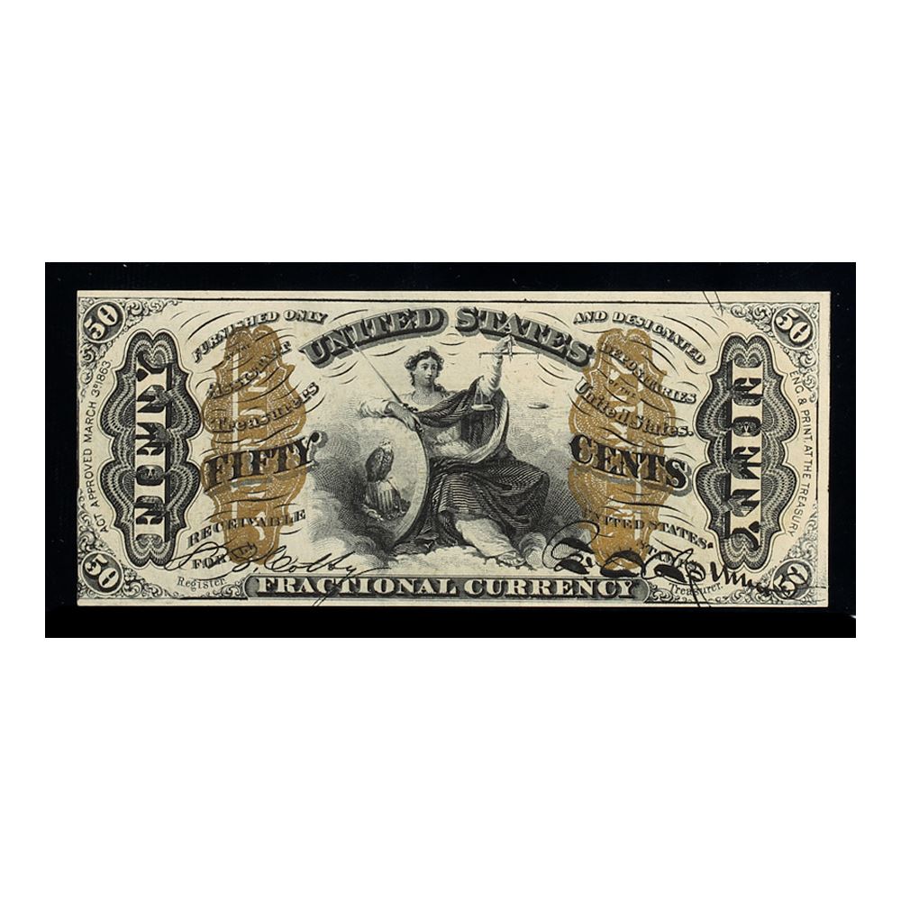 1864, 50c Fractional Currency. Third Issue, green rev. with/o surcharge, obv. w/. Fr-1358. KL-3310. This lovely Justice note possesses excellent bronzing and fantastic eye appeal. It is completely original, and is limited in grade only by a slightly tight left margin on the face. PCGS graded Choice About Uncirculated 63 PPQ. Estimated Value 350 - 400
