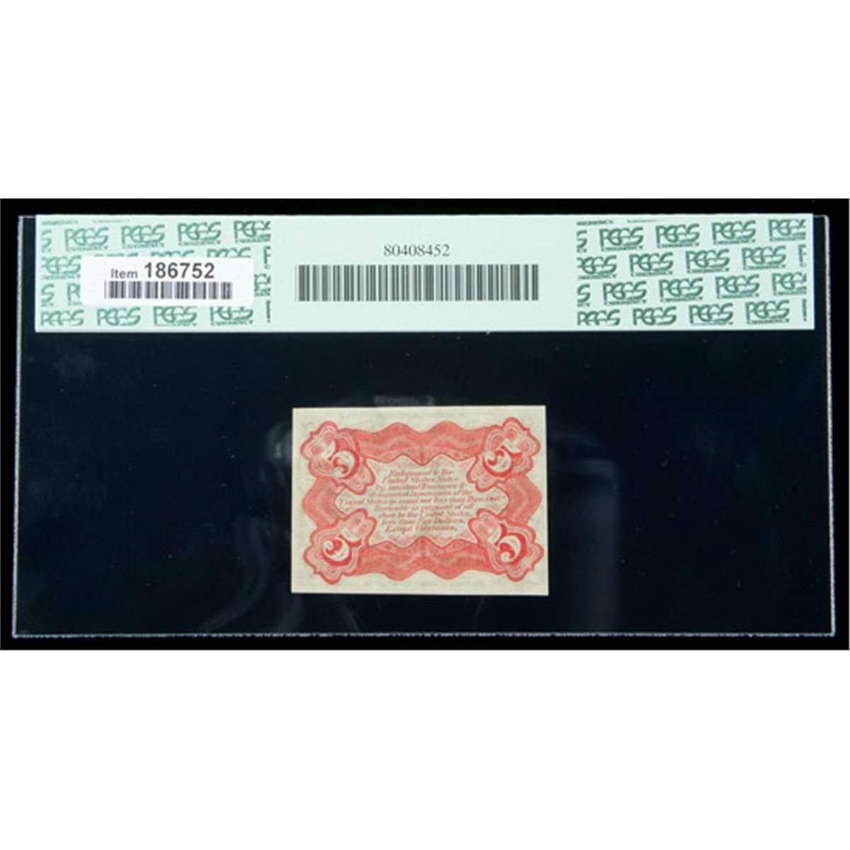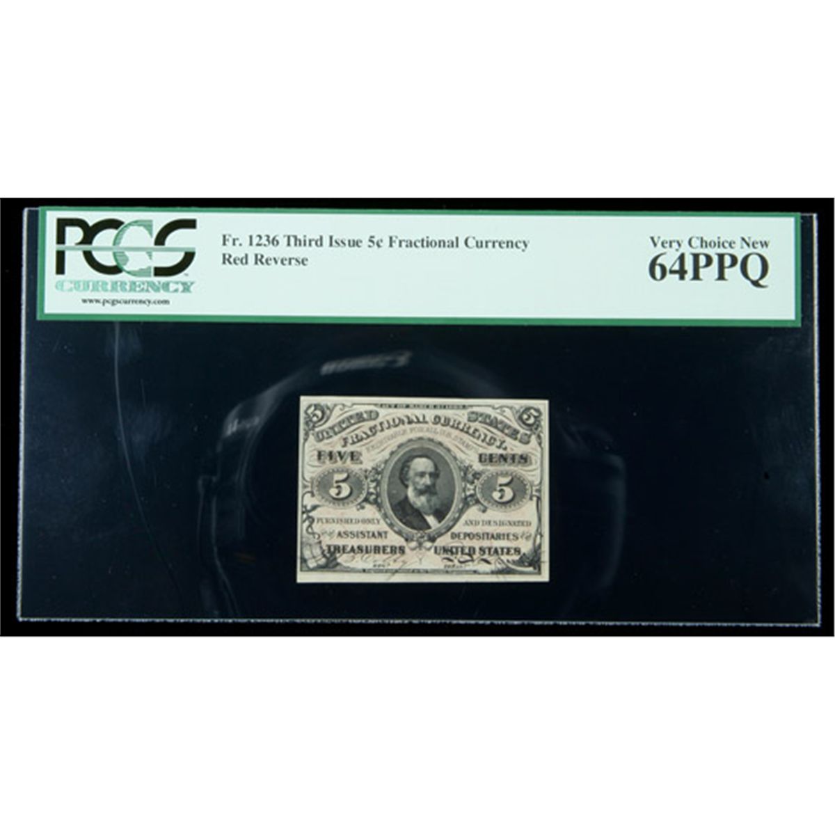 1864, 5¢ Fractional Currency. Third Issue, red reverse. PCGS Very Choice New 64PPQ. . Fr-1236. A lovely example with remarkably little of the press-bed smearing that is often seen on this type.
